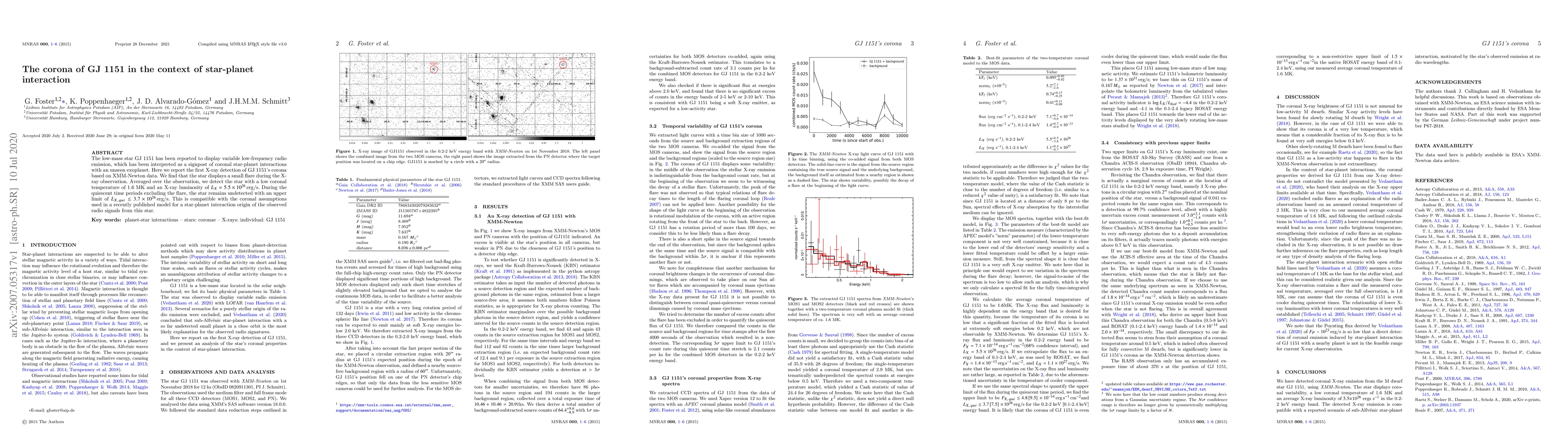 The low-mass star GJ 1151 has been reported to display variable low-frequency radio emission, which has been interpreted as a signpost of coronal star-planet interactions with an unseen exoplanet. Here we report the first X-ray detection of GJ 1151's corona based on XMM-Newton data. We find that the star displays a small flare during the X-ray observation. Averaged over the observation, we detect the star with a low coronal temperature of 1.6~MK and an X-ray luminosity of $L_X = 5.5\times 10^{26}$\,erg/s. During the quiescent time periods excluding the flare, the star remains undetected with an upper limit of $L_{X,\,qui} \leq 3.7\times 10^{26}$\,erg/s. This is compatible with the coronal assumptions used in a recently published model for a star-planet interaction origin of the observed radio signals from this star.
