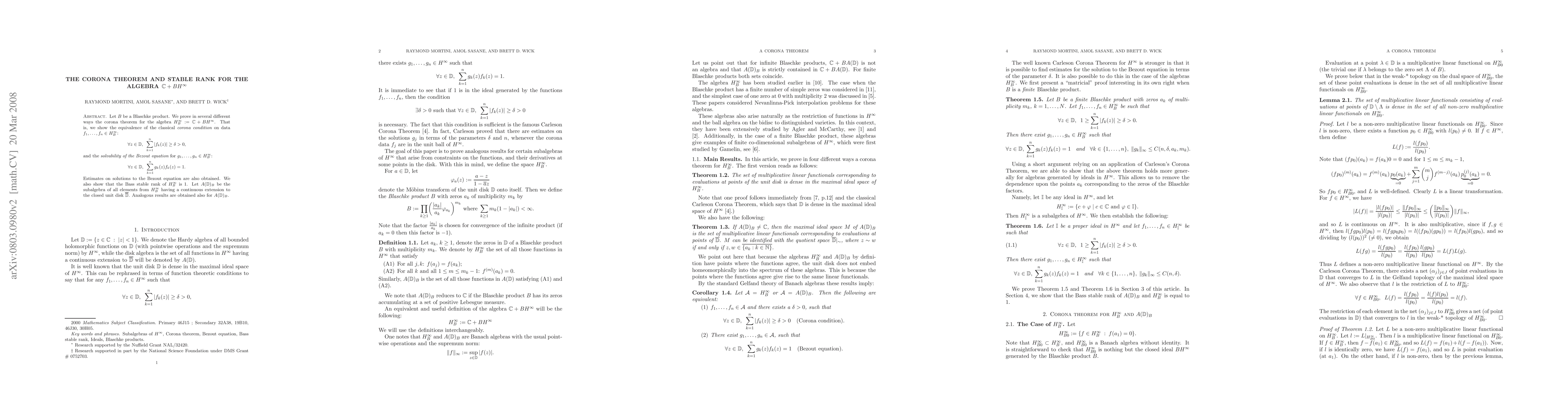 The paper proves the corona theorem for the algebra $H^ty_B$ and establishes the Bass stable rank of 1, showing equivalence between a data condition and a solvability condition for the Bezout equation, with implications for continuous extensions to the closed unit disk.