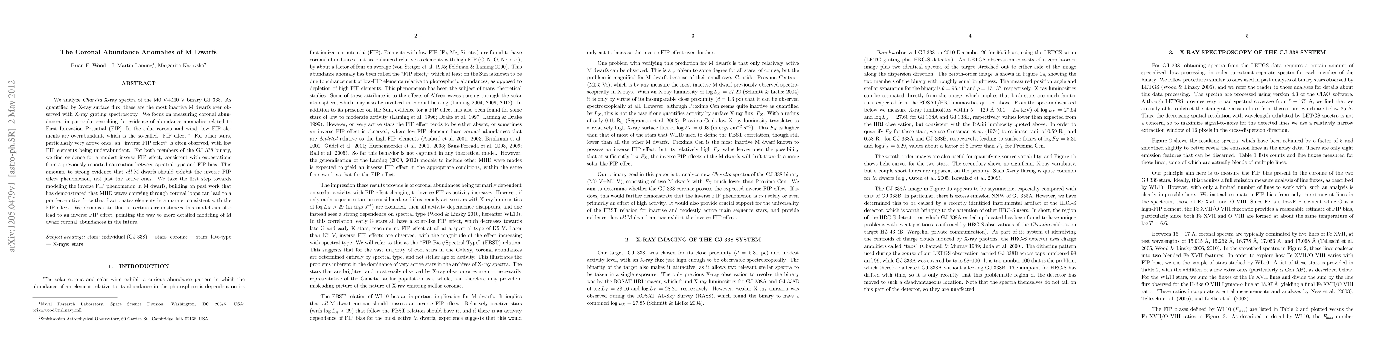 We analyze Chandra X-ray spectra of the M0 V+M0 V binary GJ 338. As quantified by X-ray surface flux, these are the most inactive M dwarfs ever observed with X-ray grating spectroscopy. We focus on measuring coronal abundances, in particular searching for evidence of abundance anomalies related to First Ionization Potential (FIP). In the solar corona and wind, low FIP elements are overabundant, which is the so-called "FIP effect." For other stars, particularly very active ones, an "inverse FIP effect" is often observed, with low FIP elements being underabundant. For both members of the GJ 338 binary, we find evidence for a modest inverse FIP effect, consistent with expectations from a previously reported correlation between spectral type and FIP bias. This amounts to strong evidence that all M dwarfs should exhibit the inverse FIP effect phenomenon, not just the active ones. We take the first step towards modeling the inverse FIP phenomenon in M dwarfs, building on past work that has demonstrated that MHD waves coursing through coronal loops can lead to a ponderomotive force that fractionates elements in a manner consistent with the FIP effect. We demonstrate that in certain circumstances this model can also lead to an inverse FIP effect, pointing the way to more detailed modeling of M dwarf coronal abundances in the future.