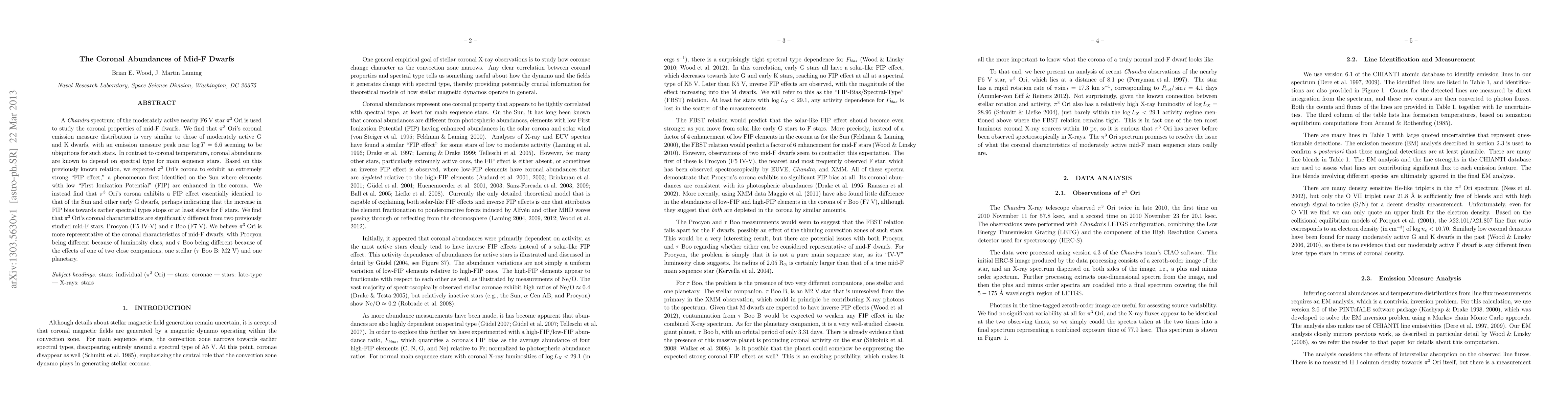 The coronal properties of mid-F dwarfs were studied using a Chandra spectrum of Pi3 Ori, finding its coronal emission measure distribution is similar to other moderately active G and K dwarfs, but with different coronal abundances compared to expected F-star behavior.
