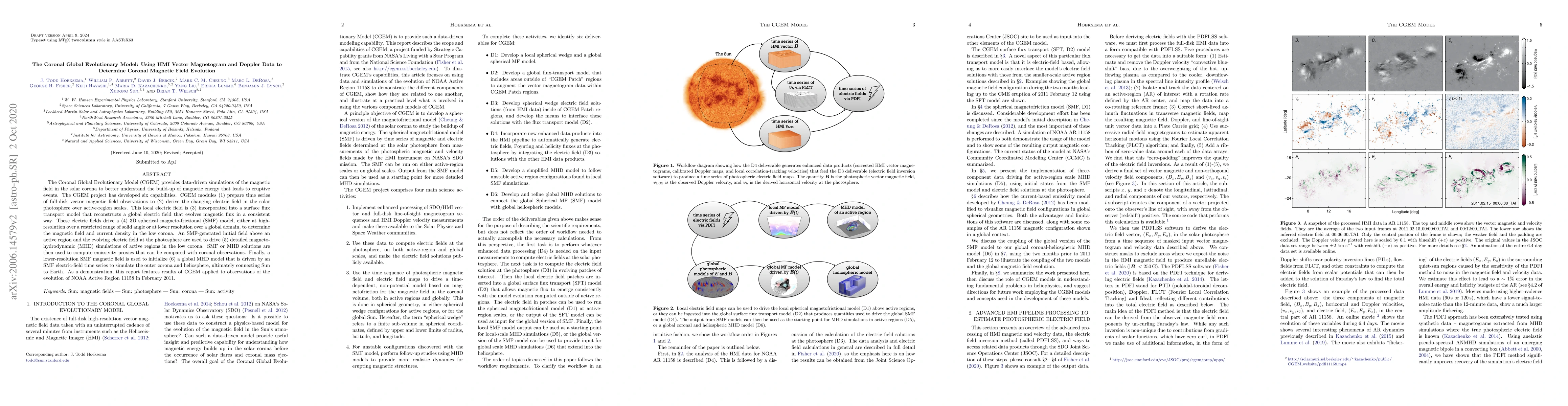 The Coronal Global Evolutionary Model (CGEM) simulates solar corona magnetic fields using HMI vector magnetogram and Doppler data, incorporating electric fields from active regions into a series of models to predict magnetic field evolution and coronal eruptive events. The model includes flux transport, magneto-frictional, and magneto-hydrodynamic simulations to connect solar magnetic activity to the heliosphere.
