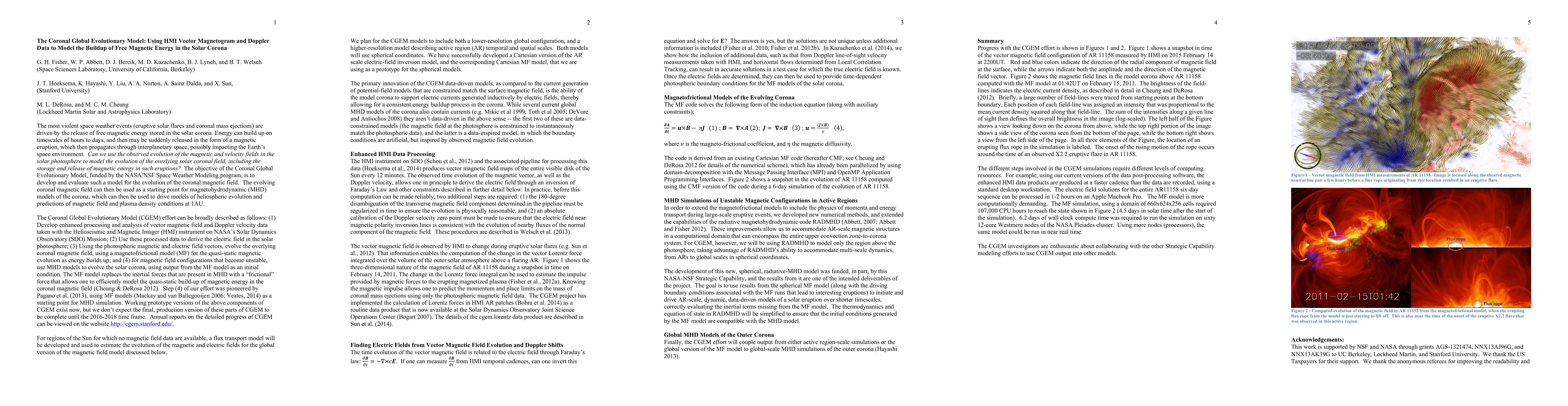 The Coronal Global Evolutionary Model (CGEM) aims to use HMI vector magnetogram and Doppler data to model the buildup of free magnetic energy in the solar corona, predicting eruptive solar flares and coronal mass ejections. This model seeks to understand how the evolution of magnetic and velocity fields in the solar photosphere influences the coronal magnetic field and its associated energy release.