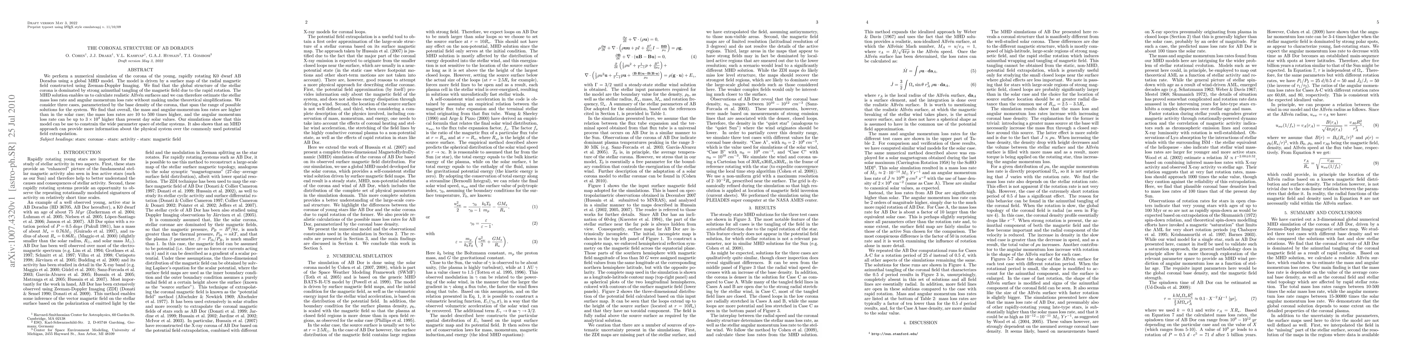 We perform a numerical simulation of the corona of the young, rapidly rotating K0 dwarf AB Doradus using a global MHD model. The model is driven by a surface map of the radial magnetic field constructed using Zeeman-Doppler Imaging. We find that the global structure of the stellar corona is dominated by strong azimuthal tangling of the magnetic field due to the rapid rotation. The MHD solution enables us to calculate realistic Alfv\'en surfaces and we can therefore estimate the stellar mass loss rate and angular momentum loss rate without making undue theoretical simplifications. We consider three cases, parametrized by the base density of the corona, that span the range of possible solutions for the system. We find that overall, the mass and angular-momentum loss rates are higher than in the solar case; the mass loss rates are 10 to 500 times higher, and the angular momentum loss rate can be up to $3\times{10}^4$ higher than present day solar values. Our simulations show that this model can be use to constrain the wide parameter space of stellar systems. It also shows that an MHD approach can provide more information about the physical system over the commonly used potential field extrapolation.