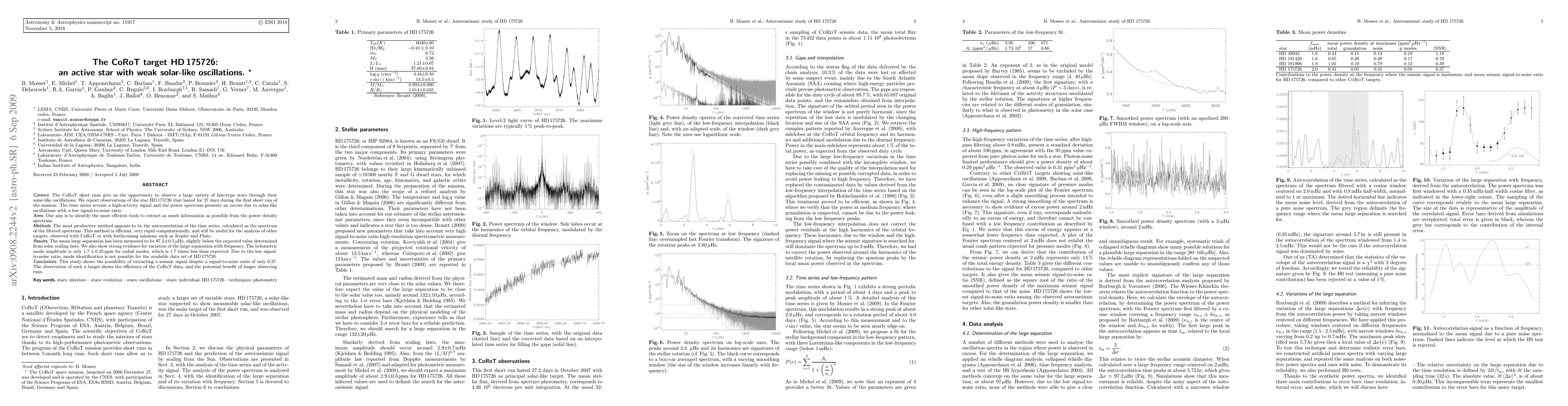 Context. The CoRoT short runs give us the opportunity to observe a large variety of late-type stars through their solar-like oscillations. We report observations of the star HD175726 that lasted for 27 days during the first short run of the mission. The time series reveals a high-activity signal and the power spectrum presents an excess due to solar-like oscillations with a low signal-to-noise ratio. Aims. Our aim is to identify the most efficient tools to extract as much information as possible from the power density spectrum. Methods. The most productive method appears to be the autocorrelation of the time series, calculated as the spectrum of the filtered spectrum. This method is efficient, very rapid computationally, and will be useful for the analysis of other targets, observed with CoRoT or with forthcoming missions such as Kepler and Plato. Results. The mean large separation has been measured to be 97.2+-0.5 microHz, slightly below the expected value determined from solar scaling laws.We also show strong evidence for variation of the large separation with frequency. The bolometric mode amplitude is only 1.7+-0.25 ppm for radial modes, which is 1.7 times less than expected. Due to the low signal-to-noise ratio, mode identification is not possible for the available data set of HD175726. Conclusions. This study shows the possibility of extracting a seismic signal despite a signal-to-noise ratio of only 0.37. The observation of such a target shows the efficiency of the CoRoT data, and the potential benefit of longer observing runs.