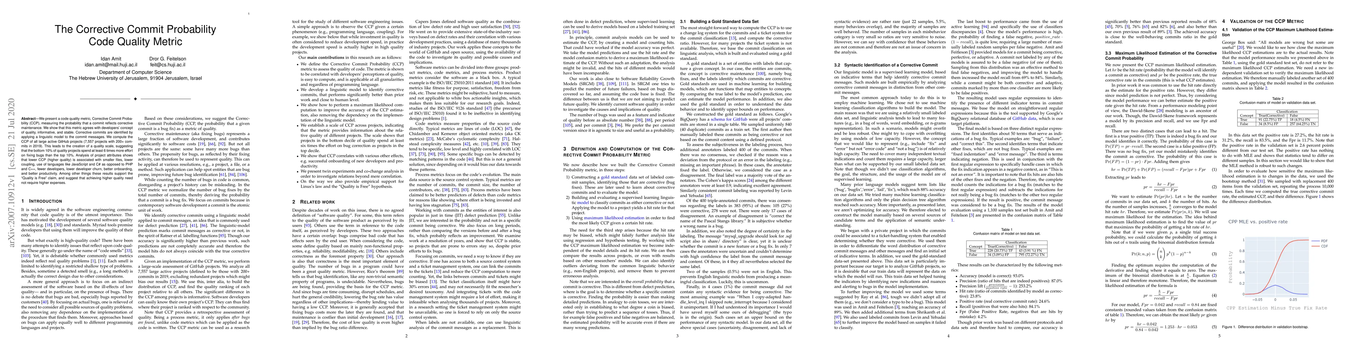 The Corrective Commit Probability (CCP) metric measures the likelihood that a commit involves corrective maintenance, correlating with developers' perceptions of quality. Analysis of 7,557 GitHub projects reveals that lower CCP correlates with better quality, smaller files, lower coupling, and fewer developers, supporting the "Quality is Free" hypothesis.