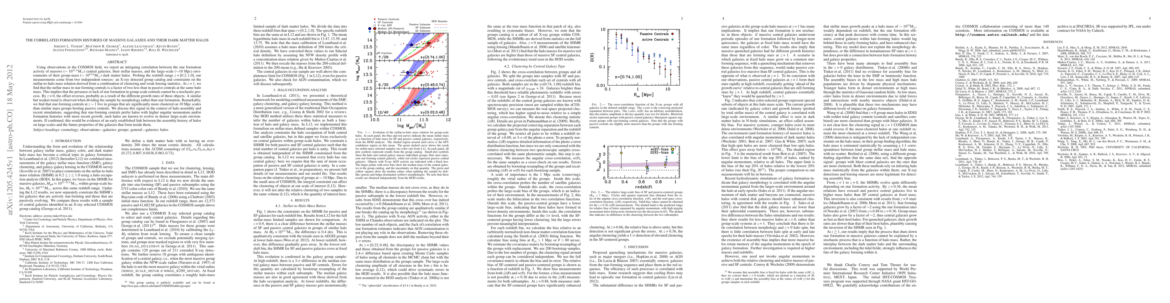 Using observations in the COSMOS field, we report an intriguing correlation between the star formation activity of massive (~10^{11.4}\msol) central galaxies, their stellar masses, and the large-scale (~10 Mpc) environments of their group-mass (~10^{13.6}\msol) dark matter halos. Probing the redshift range z=[0.2,1.0], our measurements come from two independent sources: an X-ray detected group catalog and constraints on the stellar-to-halo mass relation derived from a combination of clustering and weak lensing statistics. At z=1, we find that the stellar mass in star-forming centrals is a factor of two less than in passive centrals at the same halo mass. This implies that the presence or lack of star formation in group-scale centrals cannot be a stochastic process. By z=0, the offset reverses, probably as a result of the different growth rates of these objects. A similar but weaker trend is observed when dividing the sample by morphology rather than star formation. Remarkably, we find that star-forming centrals at z~1 live in groups that are significantly more clustered on 10 Mpc scales than similar mass groups hosting passive centrals. We discuss this signal in the context of halo assembly and recent simulations, suggesting that star-forming centrals prefer halos with higher angular momentum and/or formation histories with more recent growth; such halos are known to evolve in denser large-scale environments. If confirmed, this would be evidence of an early established link between the assembly history of halos on large scales and the future properties of the galaxies that form inside them.