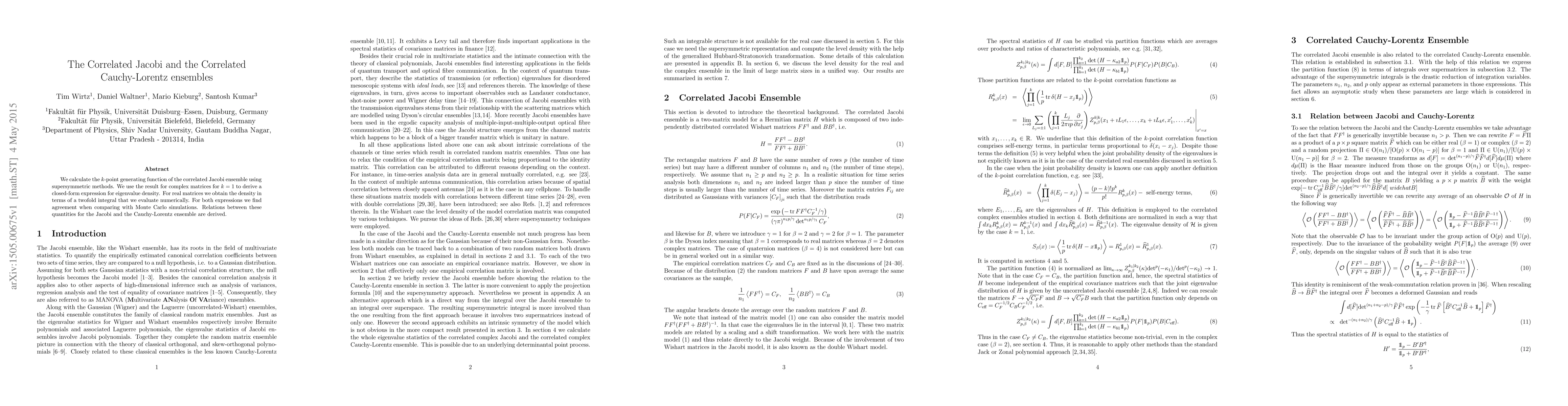 We calculate the $k$-point generating function of the correlated Jacobi ensemble using supersymmetric methods. We use the result for complex matrices for $k=1$ to derive a closed-form expression for eigenvalue density. For real matrices we obtain the density in terms of a twofold integral that we evaluate numerically. For both expressions we find agreement when comparing with Monte Carlo simulations. Relations between these quantities for the Jacobi and the Cauchy-Lorentz ensemble are derived.