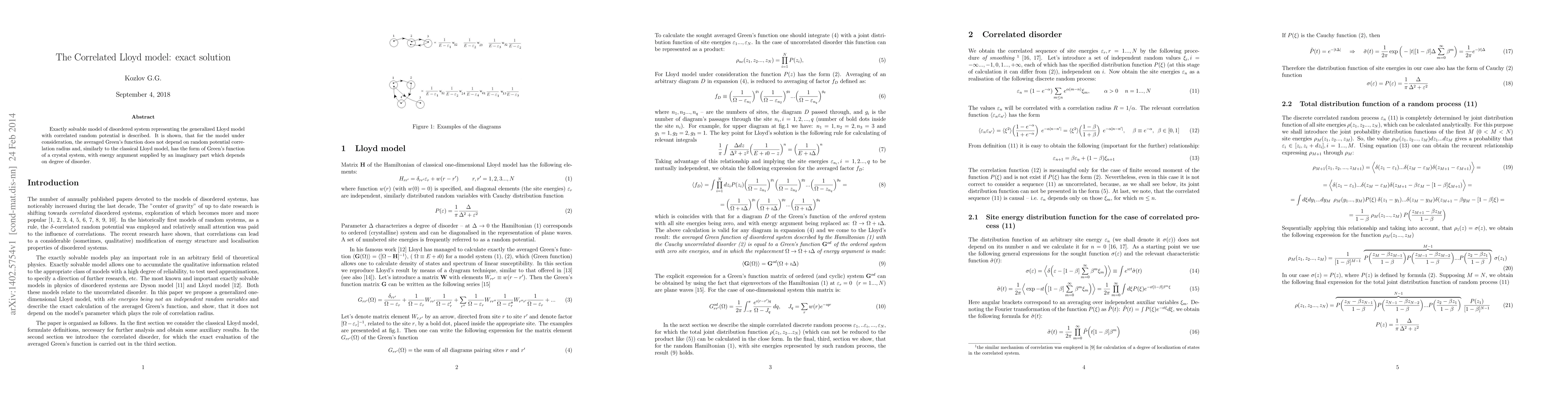 The Correlated Lloyd model provides an exactly solvable framework for disordered systems, demonstrating that the averaged Green's function remains unaffected by the correlation radius of the random potential, mirroring the classical Lloyd model with an imaginary energy component tied to disorder degree.