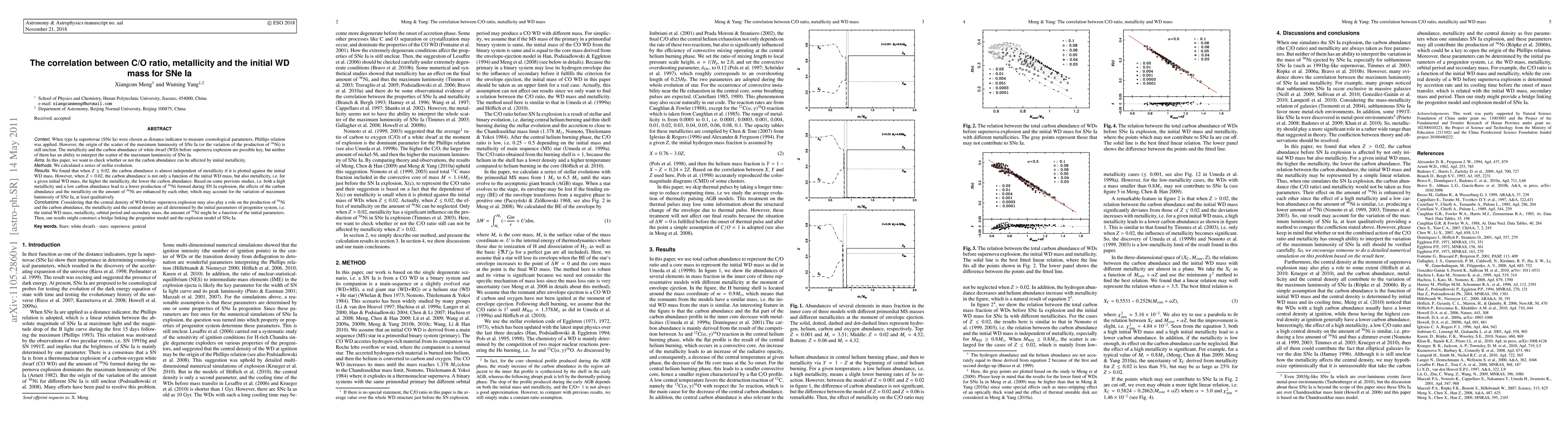 In this paper, we want to check whether or not the carbon abundance can be affected by initial metallicity. We calculated a series of stellar evolution. We found that when $Z\leq0.02$, the carbon abundance is almost independent of metallicity if it is plotted against the initial WD mass. However, when $Z>0.02$, the carbon abundance is not only a function of the initial WD mass, but also metallicity, i.e. for a given initial WD mass, the higher the metallicity, the lower the carbon abundance. Based on some previous studies, i.e. both a high metallicity and a low carbon abundance lead to a lower production of $^{\rm 56}$Ni formed during SN Ia explosion, the effects of the carbon abundance and the metallicity on the amount of $^{\rm 56}$Ni are enhanced by each other, which may account for the variation of maximum luminosity of SNe Ia, at least qualitatively. Considering that the central density of WD before supernova explosion may also play a role on the production of $^{\rm 56}$Ni and the carbon abundance, the metallicity and the central density are all determined by the initial parameters of progenitor system, i.e. the initial WD mass, metallicity, orbital period and secondary mass, the amount of $^{\rm 56}$Ni might be a function of the initial parameters. Then, our results might construct a bridge linking the progenitor model and the explosion model of SNe Ia.