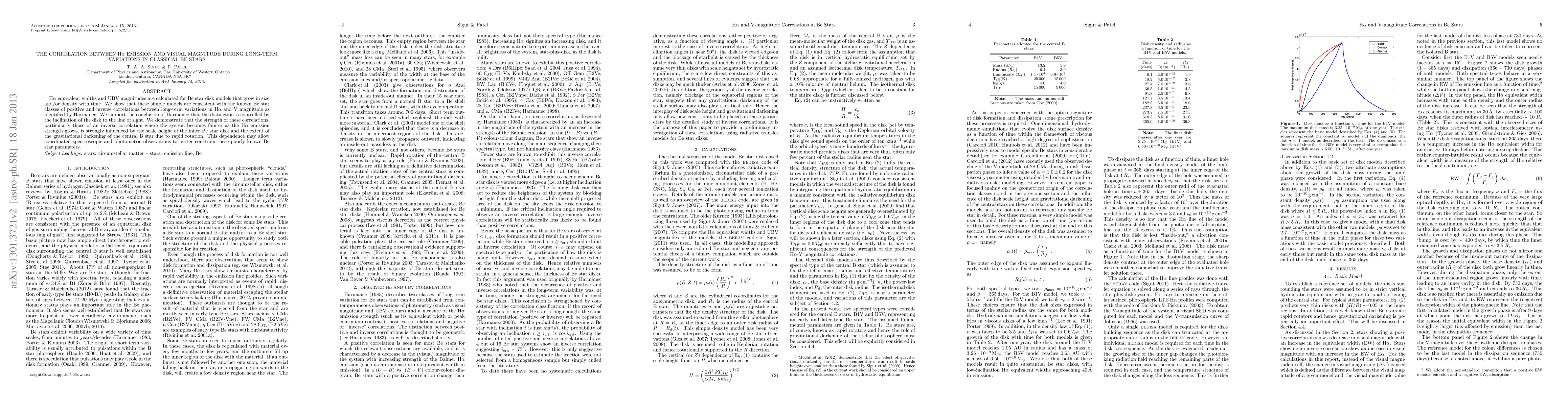This paper investigates the correlation between H\alpha\ emission and visual magnitude in classical Be stars, finding that simple disk models with time-varying size and density match observed long-term variations. The study supports Harmanec's conclusion that the correlation type is influenced by the disk's inclination and highlights the role of disk scale height and gravitational darkening in determining these correlations.