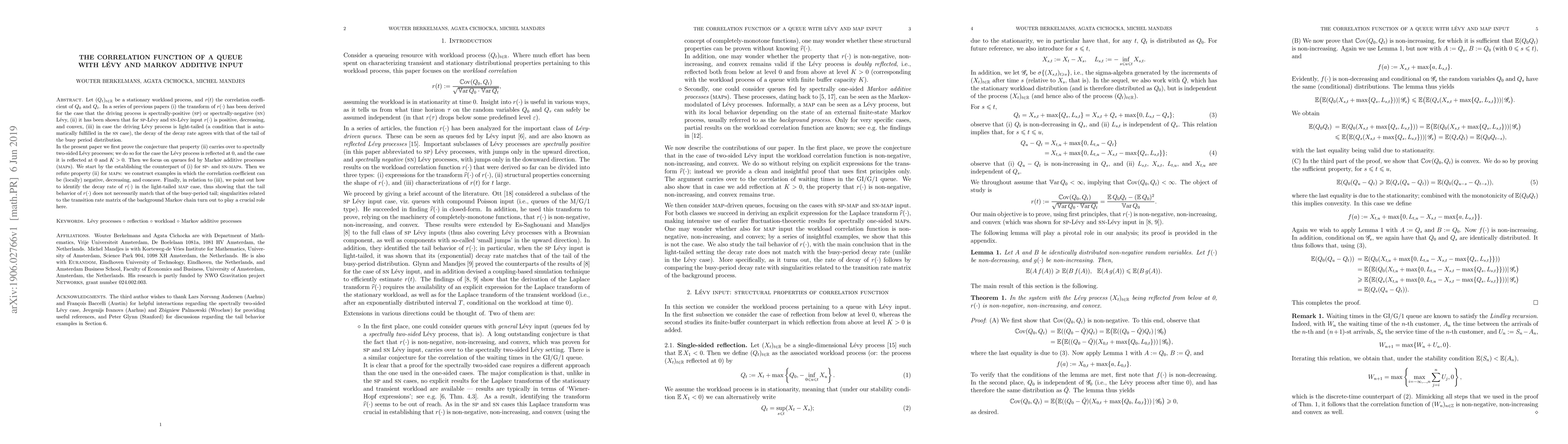 A study on queueing theory explores how different types of input processes (Levy and Markov additive) affect the correlation function of a queue, revealing key differences between spectrally-positive and negative Levy processes and Markov maps.