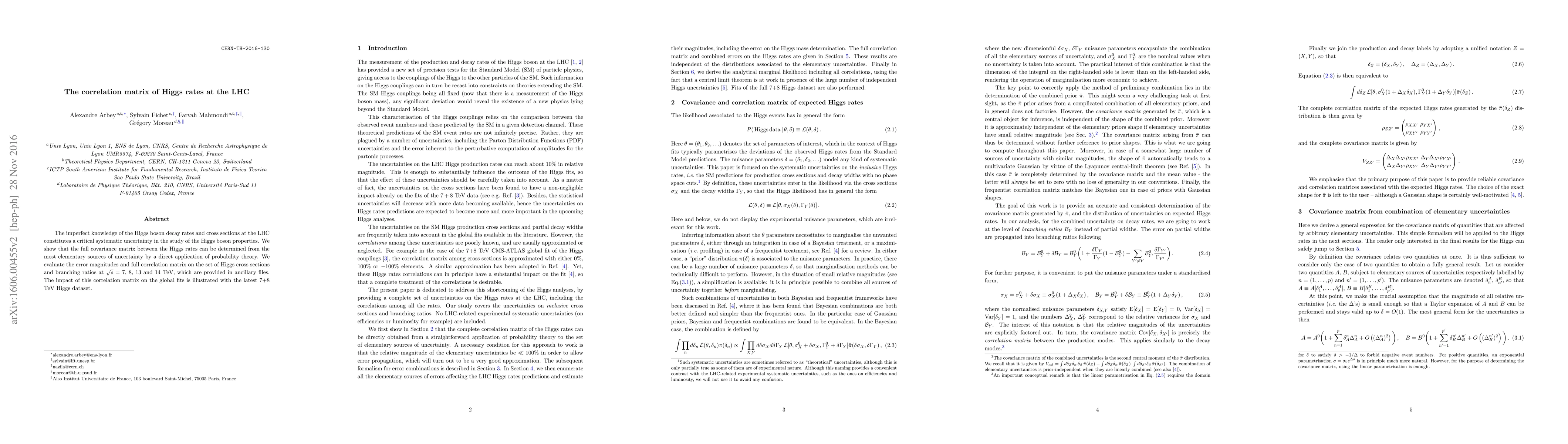 The imperfect knowledge of the Higgs boson decay rates and cross sections at the LHC constitutes a critical systematic uncertainty in the study of the Higgs boson properties. We show that the full covariance matrix between the Higgs rates can be determined from the most elementary sources of uncertainty by a direct application of probability theory. We evaluate the error magnitudes and full correlation matrix on the set of Higgs cross sections and branching ratios at $\sqrt{s}=7$, $8$, $13$ and $14$ TeV, which are provided in ancillary files. The impact of this correlation matrix on the global fits is illustrated with the latest $7$+$8$ TeV Higgs dataset.