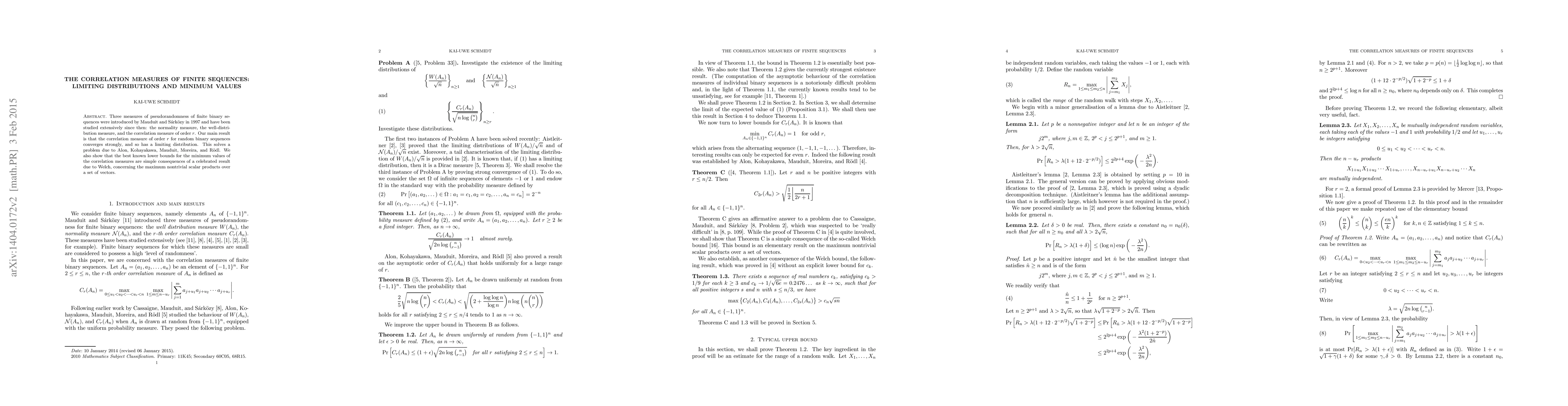 This paper investigates the pseudorandomness of finite binary sequences through three measures: normality, well-distribution, and the correlation measure of order r. The main result demonstrates that the correlation measure of order r converges strongly, establishing its limiting distribution and solving a problem posed by Alon et al. Additionally, the paper shows that the best known lower bounds for the minimum values of these measures are derived from Welch's theorem on maximum scalar products.