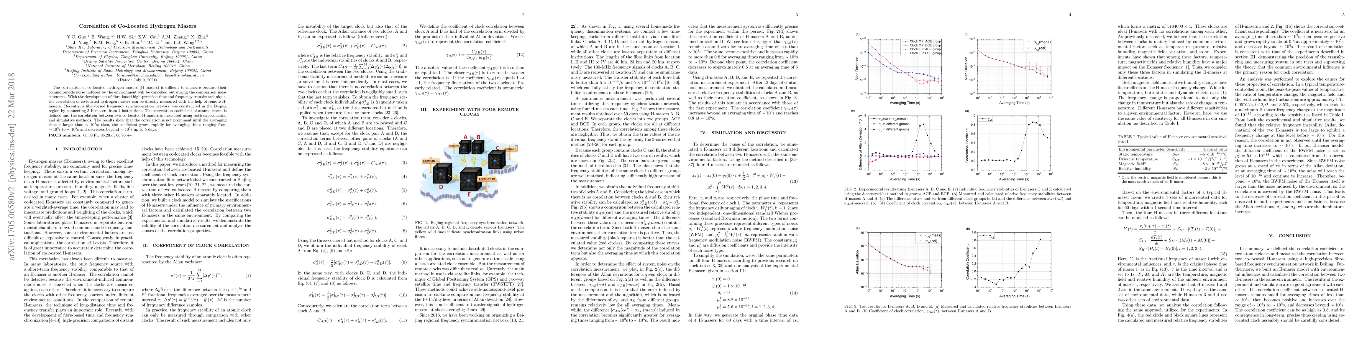 The correlation of co-located hydrogen masers (H-masers) is difficult to measure because their common-mode noise induced by the environment will be cancelled out during the comparison measurement. With the development of fibre-based high-precision time and frequency transfer technique, the correlation of co-located hydrogen masers can be directly measured with the help of remote H-masers. Recently, a fiber-based frequency synchronization network was constructed in the Beijing region by connecting 5 H-masers from 4 institutions. The correlation coefficient of atomic clocks is defined and the correlation between two co-located H-masers is measured using both experimental and simulative methods. The results show that the correlation is not prominent until the averaging time is larger than $\sim10^3$s; then, the coefficient grows rapidly for averaging times ranging from $\sim10^3$s to $\sim10^5$s and decreases beyond $\sim10^5$s up to 5 days.