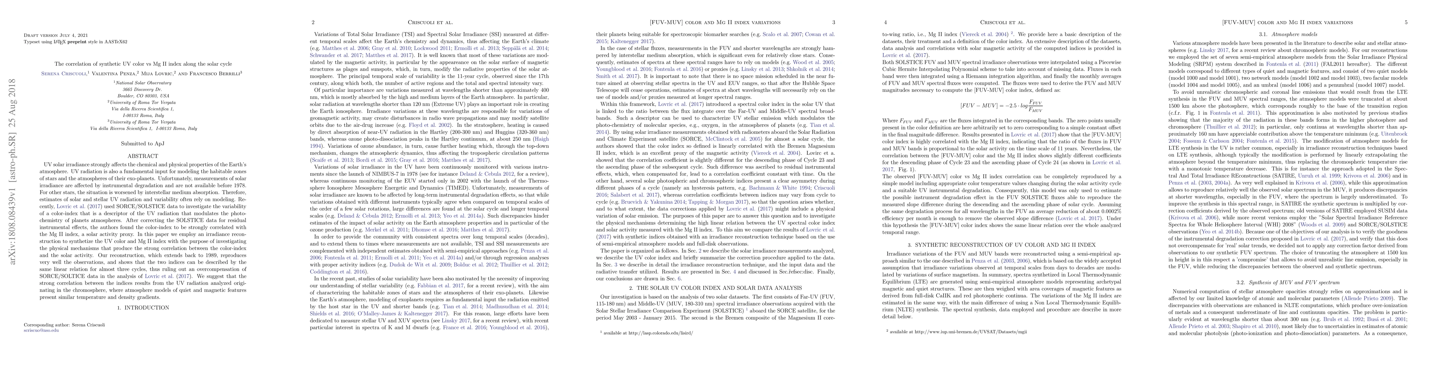 Modeling of planets' climate and habitability requires as fundamental input the UV emission of the hosting star. \citet{lovric2017} employed SORCE/SOLSTICE solar observations to introduce a UV color index which is a descriptor of the UV radiation that modulates the photochemistry of planets atmospheres. After correcting the SOLSTICE data for residual instrumental effects that produced asymmetric signals during different phases of the cycles analyzed, the authors found that the UV color index is linearly correlated with the Mg II index.In this paper we employ an irradiance reconstruction technique to synthetize the UV color and Mg II index with the purpose of investigating whether the correction applied by \citet{lovric2017} to SORCE/SOLSTICE data might have compensated for solar variations, and to investigate the physical mechanisms that produce such a strong correlation between the UV color index and the solar activity. Reconstructed indices reproduce very well the observations and present the same strong linear dependence. Moreover our reconstruction, which extends back to 1989, shows that the UV color - Mg II index relation can be described by the same linear relation for almost three cycles, thus ruling out an overcompensation of SORCE/SOLTICE data in the analysis of \citet{lovric2017}. We suggest that the strong correlation between the indices results from the fact that most of the Far- and Middle- UV radiation originates in the chromosphere, where atmosphere models of quiet and magnetic features present similar temperature and density gradients.