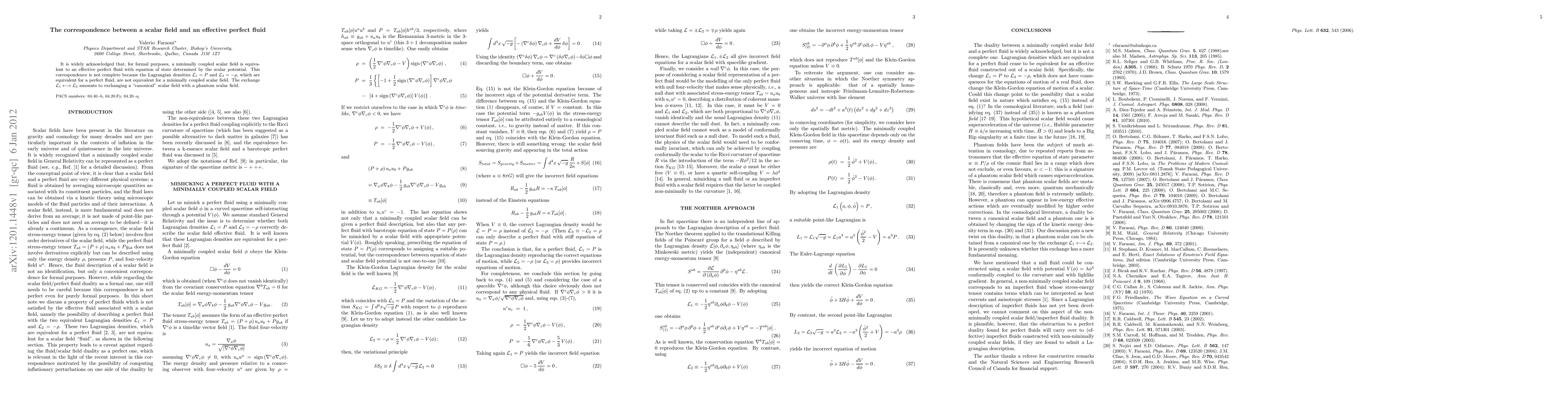 It is widely acknowledged that, for formal purposes, a minimally coupled scalar field is equivalent to an effective perfect fluid with equation of state determined by the scalar potential. This correspondence is not complete because the Lagrangian densities P and -rho, which are equivalent for a perfect fluid, are not equivalent for a minimally coupled scalar field. The exchange between these two Lagrangian densities amounts to exchanging a canonical scalar field with a phantom scalar field.