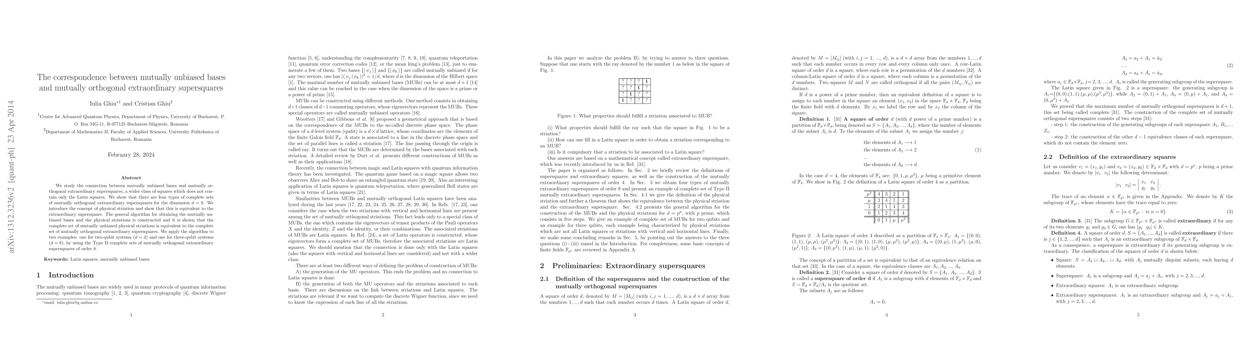 This paper explores the relationship between mutually unbiased bases and mutually orthogonal extraordinary supersquares, revealing four types of complete sets for dimension $d=8$. It introduces physical striation, demonstrating its equivalence to extraordinary supersquares, and provides an algorithm to derive these sets, applied to two-qubit and three-qubit systems.