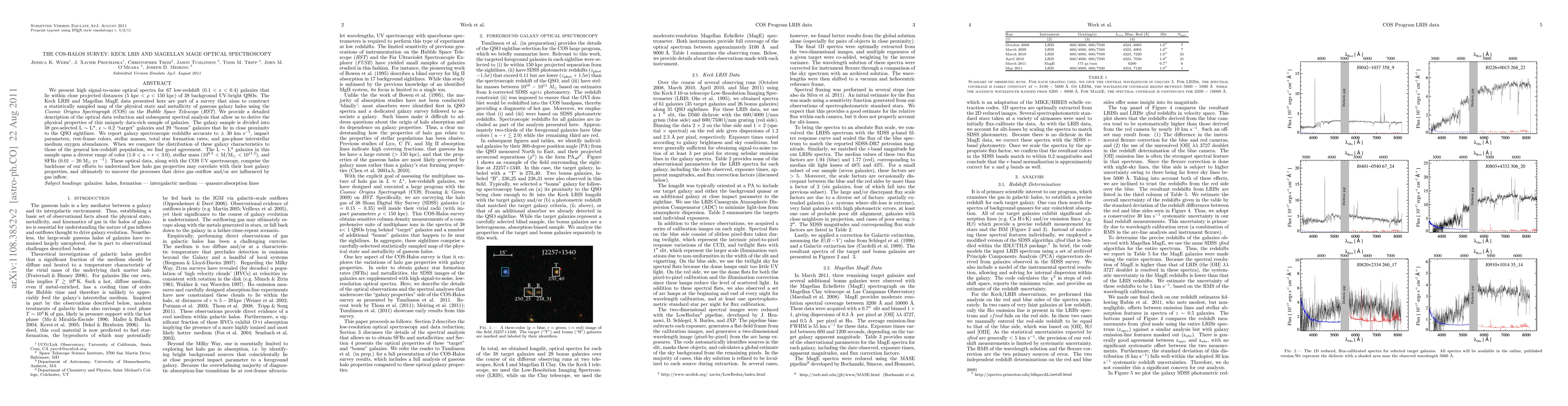 We present high signal-to-noise optical spectra for 67 low-redshift (0.1 < z < 0.4) galaxies that lie within close projected distances (5 kpc < rho < 150 kpc) of 38 background UV-bright QSOs. The Keck LRIS and Magellan MagE data presented here are part of a survey that aims to construct a statistically sampled map of the physical state and metallicity of gaseous galaxy halos using the Cosmic Origins Spectrograph (COS) on the Hubble Space Telescope (HST). We provide a detailed description of the optical data reduction and subsequent spectral analysis that allow us to derive the physical properties of this uniquely data-rich sample of galaxies. The galaxy sample is divided into 38 pre-selected L ~ L*, z ~ 0.2 "target" galaxies and 29 "bonus" galaxies that lie in close proximity to the QSO sightlines. We report galaxy spectroscopic redshifts accurate to +/- 30 km s-1, impact parameters, rest-frame colors, stellar masses, total star formation rates, and gas-phase interstellar medium oxygen abundances. When we compare the distribution of these galaxy characteristics to those of the general low-redshift population, we find good agreement. The L ~ L* galaxies in this sample span a diverse range of color (1.0 < u-r < 3.0), stellar mass (10^9.5 < M/M_sun < 10^11.5), and SFRs (0.01 - 20 M_sun yr-1). These optical data, along with the COS UV spectroscopy, comprise the backbone of our efforts to understand how halo gas properties may correlate with their host galaxy properties, and ultimately to uncover the processes that drive gas outflow and/or are influenced by gas inflow.