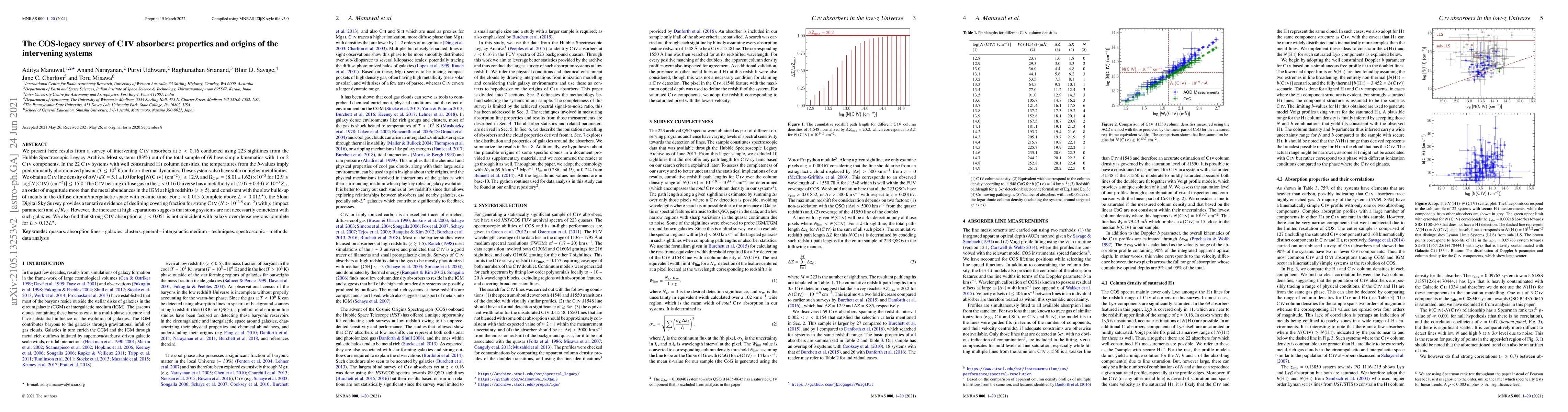 We present here results from a survey of intervening C IV absorbers at $z < 0.16$ conducted using 223 sightlines from the Hubble Spectroscopic Legacy Archive. Most systems (83%) out of the total sample of 69 have simple kinematics with 1 or 2 C IV components. In the 22 C IV systems with well constrained H I column densities, the temperatures from the $b$-values imply predominantly photoionized plasma ($T\leq 10^5$ K) and non-thermal dynamics. These systems also have solar or higher metallicities. We obtain a C IV line density of $d\mathcal{N}/dX = 5.1\pm 1.0$ for $\log [N(C~IV)~(cm^{-2})]\geq12.9$, and $\Omega_{C~IV}=(8.01\pm 1.62) \times 10^{-8}$ for $12.9 \leq \log [N(C~IV)~(cm^{-2})] \leq 15.0$. The C IV bearing diffuse gas in the $z < 0.16$ Universe has a metallicity of $(2.07~{\pm}~0.43)~\times~10^{-3}$ Z$_{\odot}$, an order of magnitude more than the metal abundances in the IGM at high redshifts ($z \gtrsim 5$), and consistent with the slow build-up of metals in the diffuse circum/intergalactic space with cosmic time. For $z<0.015$ (complete above $L>0.01L^\star$), the Sloan Digital Sky Survey provides a tentative evidence of declining covering fraction for strong C IV ($N>10^{13.5}~cm^{-2}$) with $\rho$ (impact parameter) and $\rho/R_\mathrm{vir}$. However, the increase at high separations suggests that strong systems are not necessarily coincident with such galaxies. We also find that strong C IV absorption at $z<0.051$ is not coincident with galaxy over-dense regions complete for $L>0.13L^\star$