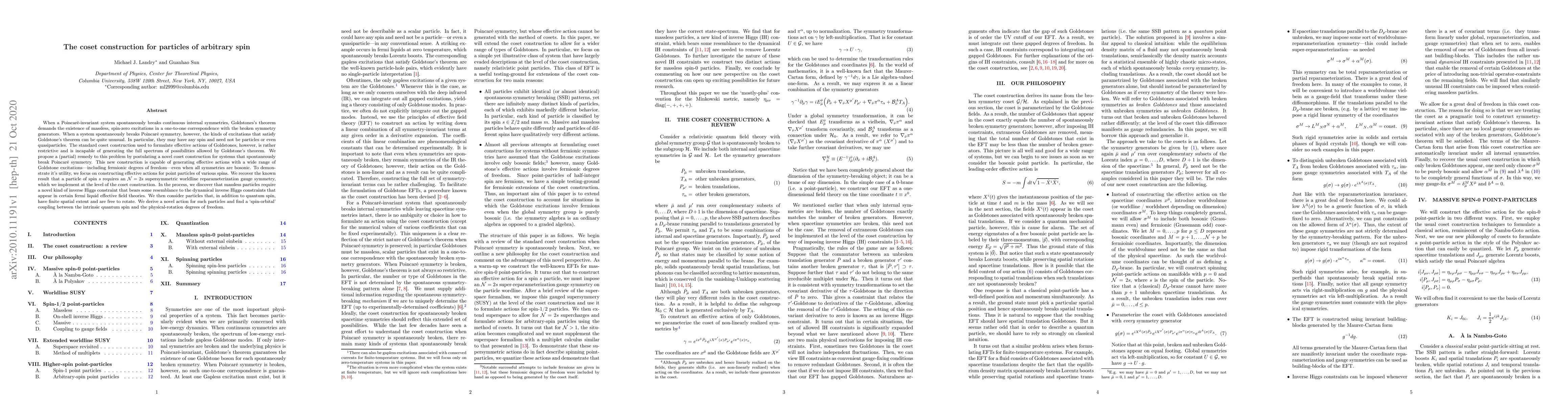 When a Poincar\'e-invariant system spontaneously breaks continuous internal symmetries, Goldstones's theorem demands the existence of massless, spin-zero excitations in a one-to-one correspondence with the broken symmetry generators. When a system spontaneously breaks Poincar\'e symmetry, however, the kinds of excitations that satisfy Goldstone's theorem can be quite unusual. In particular, they may have any spin and need not be particles or even quasiparticles. The standard coset construction used to formulate effective actions of Goldstones, however, is rather restrictive and is incapable of generating the full spectrum of possibilities allowed by Goldstone's theorem. We propose a (partial) remedy to this problem by postulating a novel coset construction for systems that spontaneously break Poincar\'e symmetry. This new construction is capable of generating effective actions with a wide range of Goldstone excitations---including fermionic degrees of freedom---even when all symmetries are bosonic. To demonstrate it's utility, we focus on constructing effective actions for point particles of various spins. We recover the known result that a particle of spin $s$ requires an $\mathcal N=2s$ supersymmetric worldline reparameterization gauge symmetry, which we implement at the level of the coset construction. In the process, we discover that massless particles require a novel kind of inverse Higgs constraint that bears some resemblance to the dynamical inverse Higgs constraints that appear in certain fermi liquid effective field theories. We then consider particles that, in addition to quantum spin, have finite spatial extent and are free to rotate. We derive a novel action for such particles and find a `spin-orbital' coupling between the intrinsic quantum spin and the physical-rotation degrees of freedom.