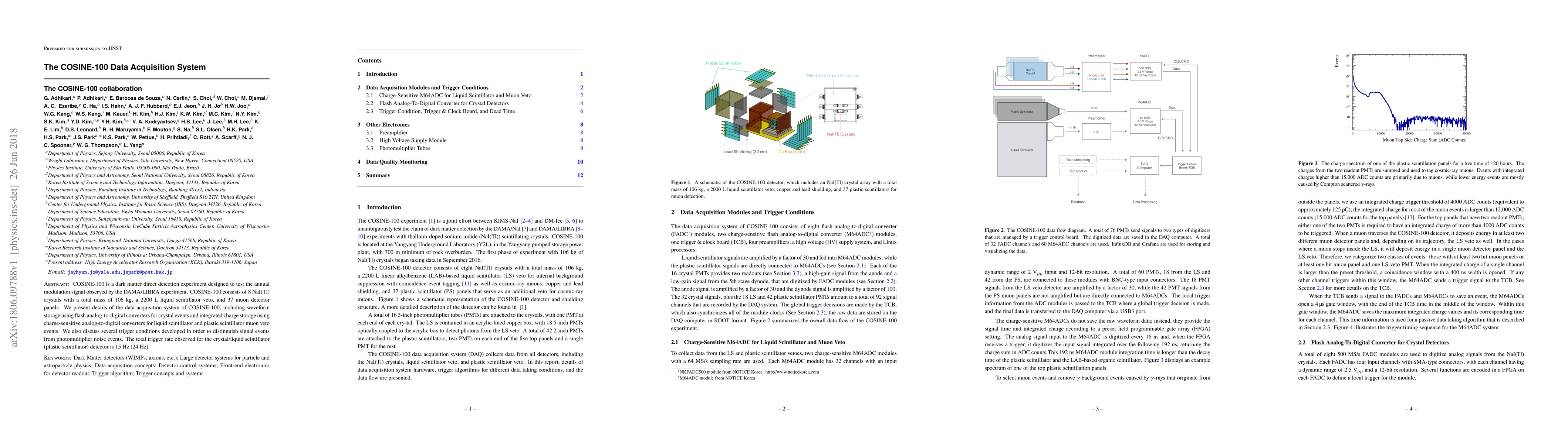 The COSINE-100 data acquisition system is designed to detect dark matter using NaI(Tl) crystals and liquid scintillator veto. The system achieved a trigger rate of 15 Hz for crystal/liquid scintillator detector events.