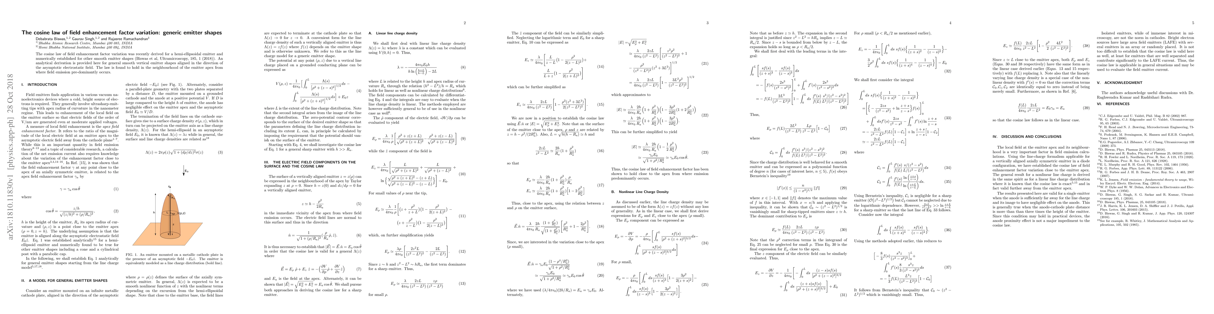 Summary: This paper derives an analytical cosine law for the field enhancement factor variation applicable to general smooth vertical emitter shapes aligned with the electrostatic field, extending previous findings for hemi-ellipsoidal emitters. The law is valid near the emitter apex where field emission predominantly occurs.