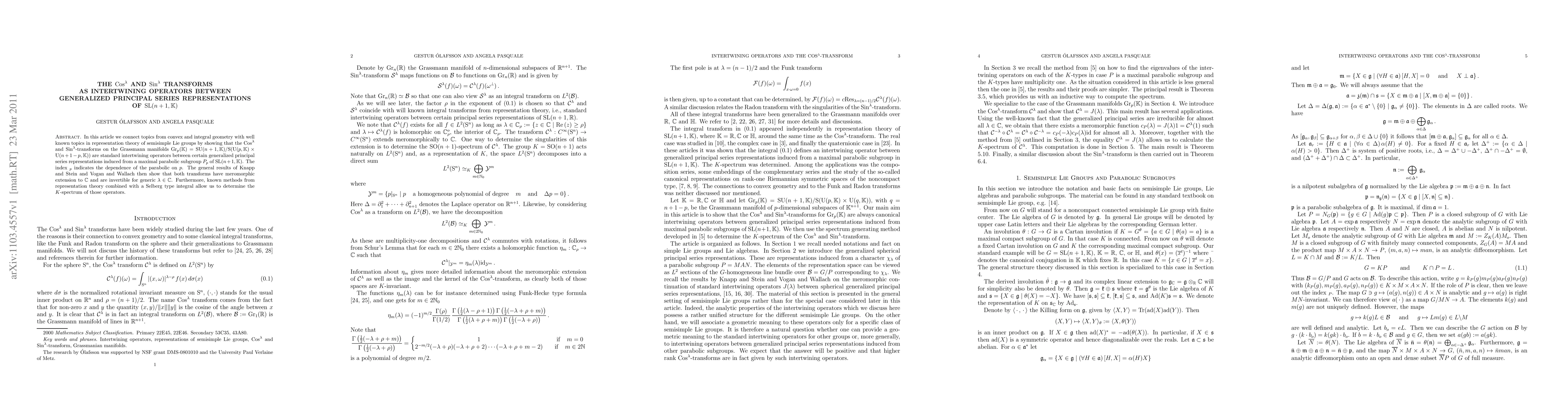 Researchers show that $Cos^ heta$ and $Sin^ heta$ transforms on Grassmann manifolds are intertwining operators between generalized principal series representations of SL(n+1,K), connecting convex geometry to representation theory.