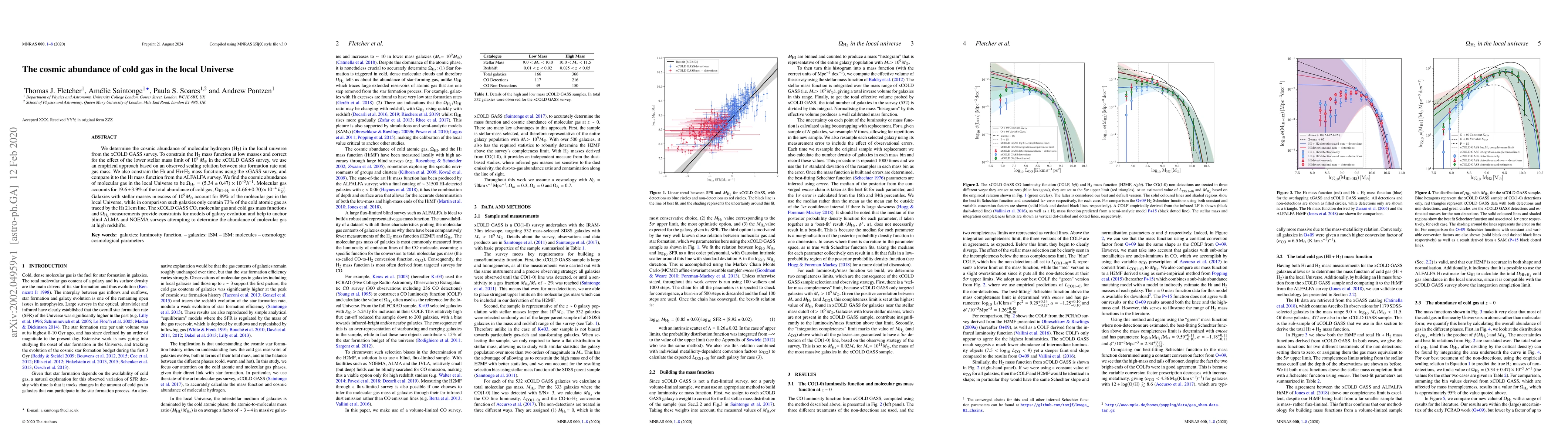 This paper determines the cosmic abundance of molecular hydrogen (H2) in the local Universe to be Omega_H2=(5.34±0.47)×10^-5 h^-1, accounting for 19.6% of the total cold gas abundance. Galaxies with stellar masses above 10^9 Msun dominate the molecular gas, while they only account for 73% of the cold atomic gas.