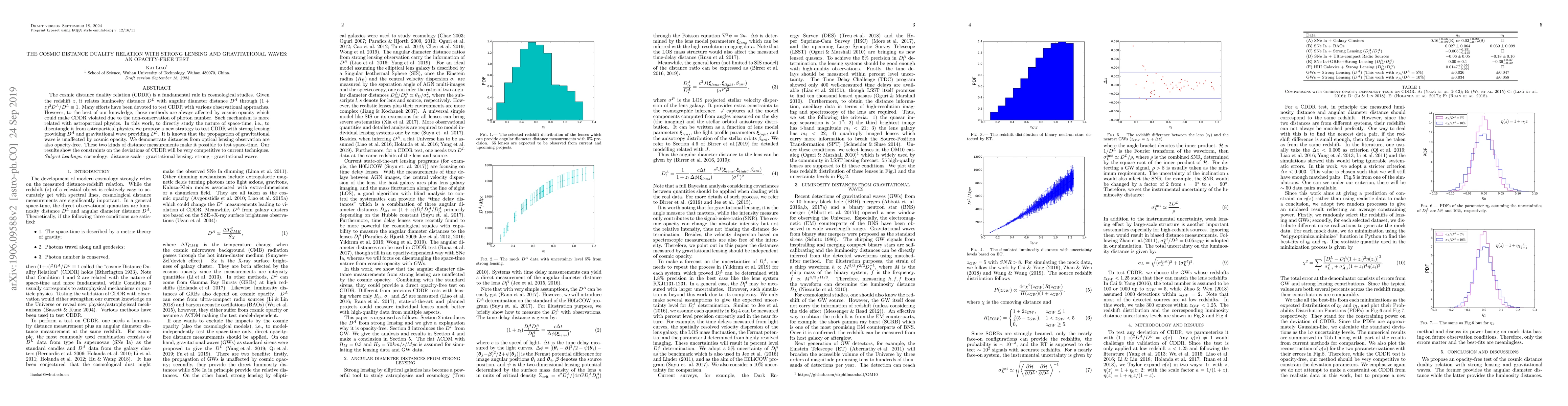 This paper proposes a new method to test the cosmic distance duality relation (CDDR) using strong lensing and gravitational waves, which are unaffected by cosmic opacity. This approach aims to provide an opacity-free test, offering competitive constraints on deviations from the CDDR compared to current techniques.