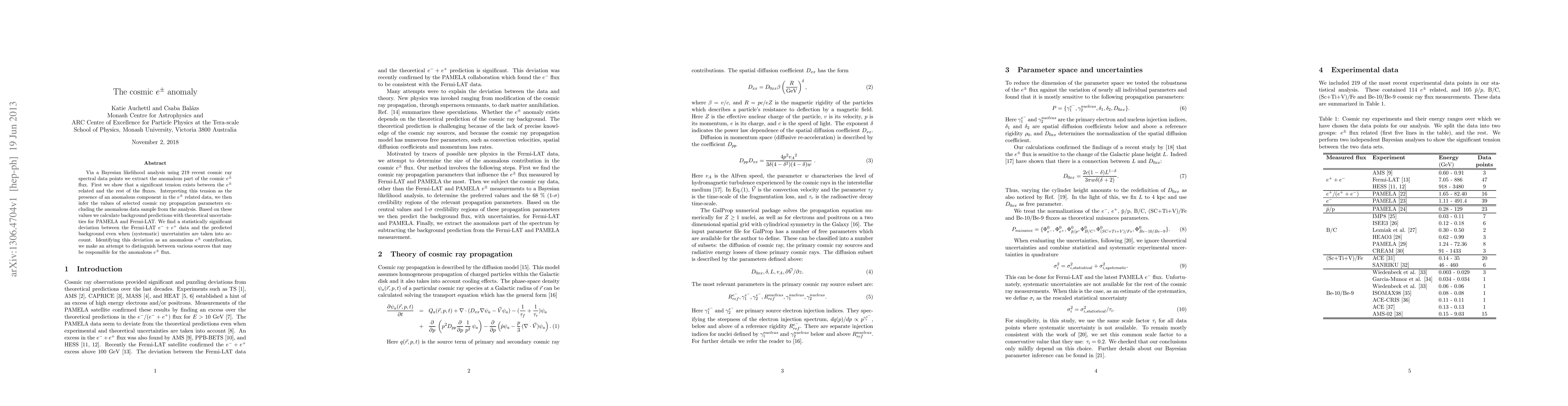 Via a Bayesian likelihood analysis using 219 recent cosmic ray spectral data points we extract the anomalous part of the cosmic $e^\pm$ flux. First we show that a significant tension exists between the $e^\pm$ related and the rest of the fluxes. Interpreting this tension as the presence of an anomalous component in the $e^\pm$ related data, we then infer the values of selected cosmic ray propagation parameters excluding the anomalous data sample from the analysis. Based on these values we calculate background predictions with theoretical uncertainties for PAMELA and Fermi-LAT. We find a statistically significant deviation between the Fermi-LAT $e^-+e^+$ data and the predicted background even when (systematic) uncertainties are taken into account. Identifying this deviation as an anomalous $e^\pm$ contribution, we make an attempt to distinguish between various sources that may be responsible for the anomalous $e^\pm$ flux.