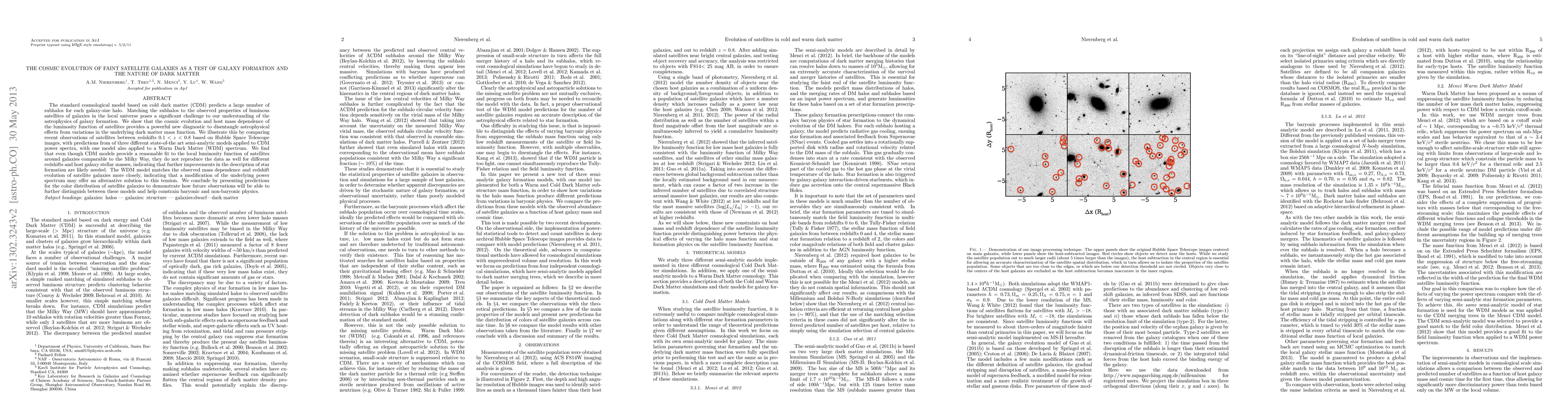 The standard cosmological model based on cold dark matter (CDM) predicts a large number of subhalos for each galaxy-size halo. It is well known that matching the subhalos to the observed properties of luminous satellites of galaxies in the local universe poses a significant challenge to our understanding of the astrophysics of galaxy formation. We show that the cosmic evolution and host mass dependence of the luminosity function of satellites provides a powerful new diagnostic to disentangle astrophysical effects from variations in the underlying dark matter mass function. We illustrate this by comparing the results of recent observations of satellites out to $z=0.8$ based on Hubble Space Telescope images with the predictions of three different sets of state-of-the art semi-analytic models with underlying CDM power spectra and one semi-analytic model with an underlying Warm Dark Matter (WDM) power spectrum. We find that even though CDM models provide a reasonable fit to the local luminosity function of satellites around galaxies comparable or slightly larger than the Milky Way, they do not reproduce the data as well for different redshift and host galaxy stellar mass. This tension indicates that further improvements are likely to be needed in the description of star formation if the models are to be reconciled with the data. The WDM model matches the observed mass dependence and redshift evolution of satellite galaxies more closely than any of the CDM models, indicating that a modification of the underlying power spectrum may offer an alternative solution to this tension. We conclude by presenting predictions for the color magnitude relation of satellite galaxies to demonstrate how future observations will be able to further distinguish between these models and help constrain baryonic and non-baryonic physics.