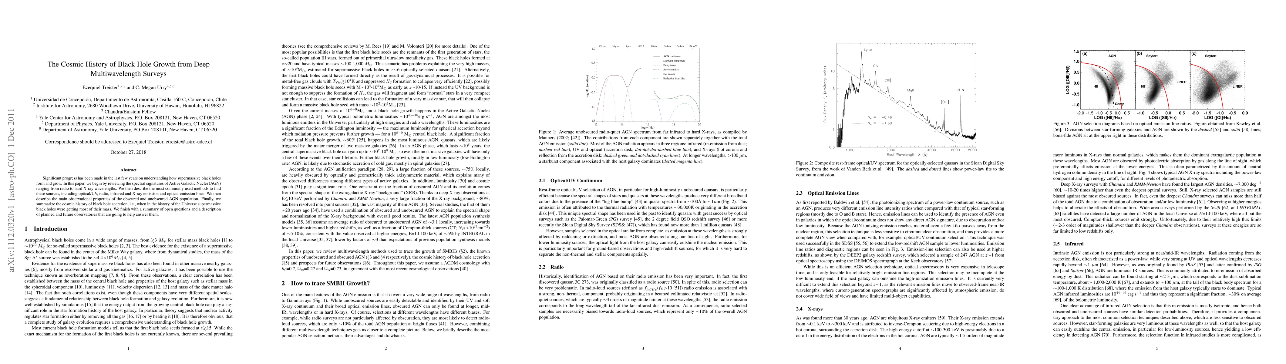 This paper reviews the spectral signatures and detection methods of Active Galactic Nuclei (AGN) across various wavelengths, summarizing the cosmic history of black hole growth and highlighting open questions and future observational plans.