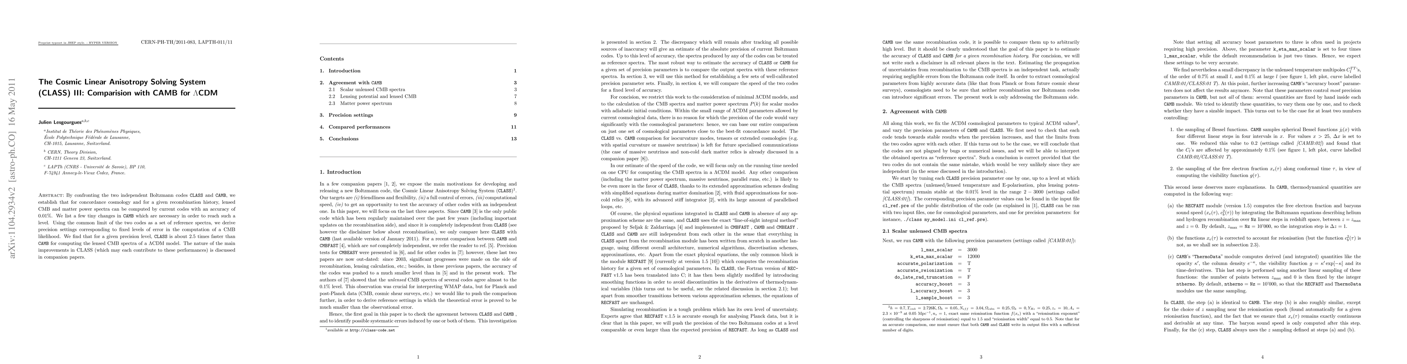 Two cosmology codes, CLASS and CAMB, were compared for computing CMB and matter power spectra with 0.01% accuracy. CLASS is found to be about 2.5 times faster than CAMB for the same precision level.