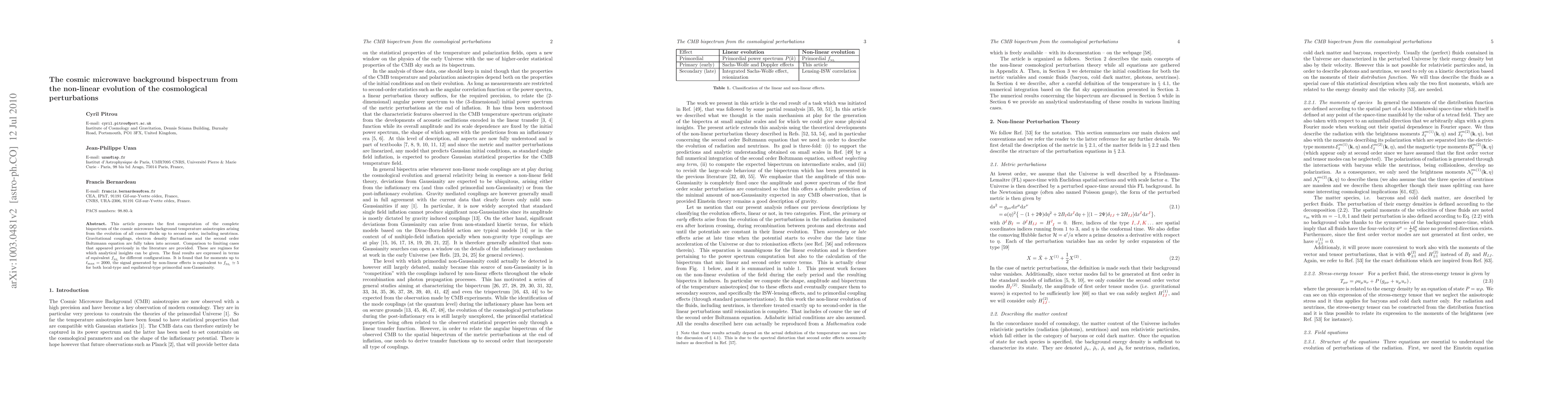This article presents the first computation of the complete bispectrum of the cosmic microwave background temperature anisotropies arising from the evolution of all cosmic fluids up to second order, including neutrinos. Gravitational couplings, electron density fluctuations and the second order Boltzmann equation are fully taken into account. Comparison to limiting cases that appeared previously in the literature are provided. These are regimes for which analytical insights can be given. The final results are expressed in terms of equivalent fNL for different configurations. It is found that for moments up to lmax=2000, the signal generated by non-linear effects is equivalent to fNL~5 for both local-type and equilateral-type primordial non-Gaussianity.