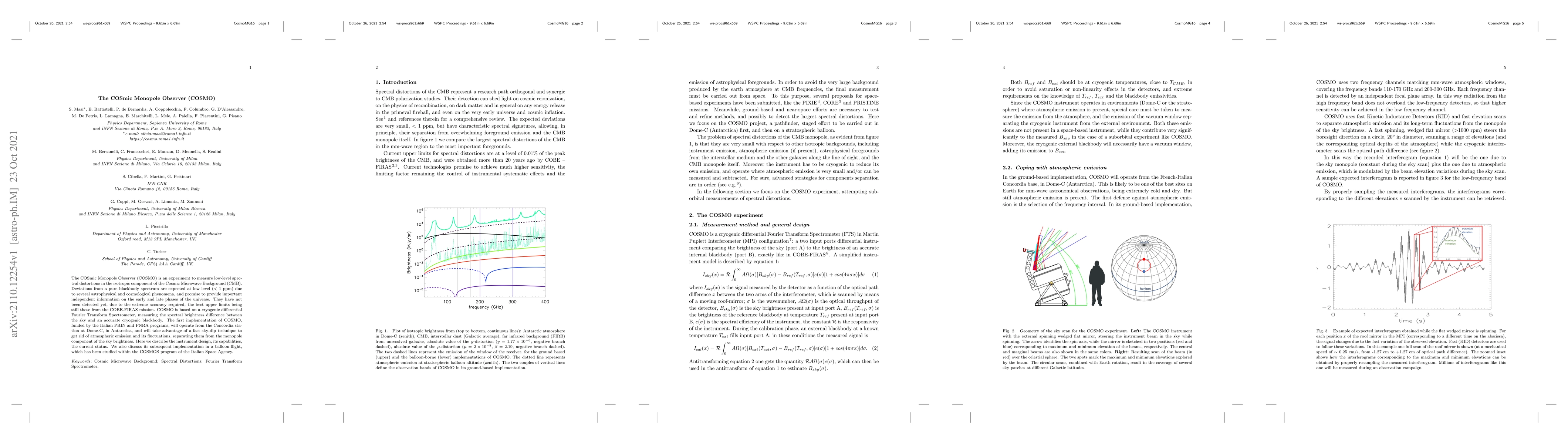 The COSMO experiment aims to detect low-level spectral distortions in the Cosmic Microwave Background (CMB) using a cryogenic spectrometer, with the goal of gaining insights into the universe's early and late phases. The first COSMO implementation will operate at Dome-C in Antarctica, utilizing a sky-dip technique to isolate CMB signals from atmospheric interference.