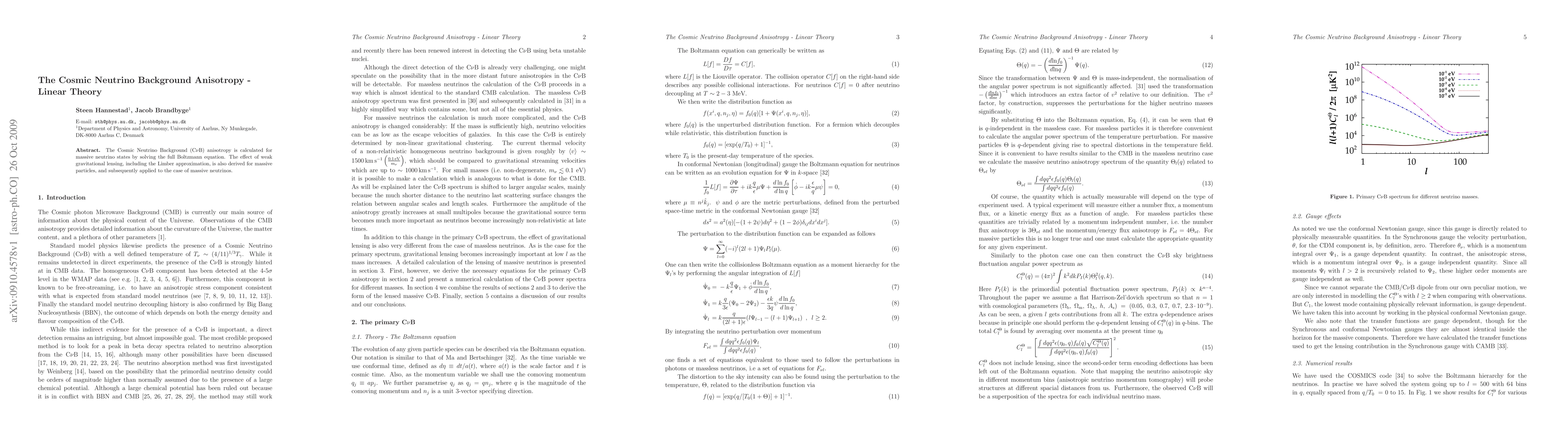 This paper calculates the anisotropy of the cosmic neutrino background for massive neutrinos using the full Boltzmann equation, and derives the effect of weak gravitational lensing, including the Limber approximation, specifically applied to massive neutrinos.
