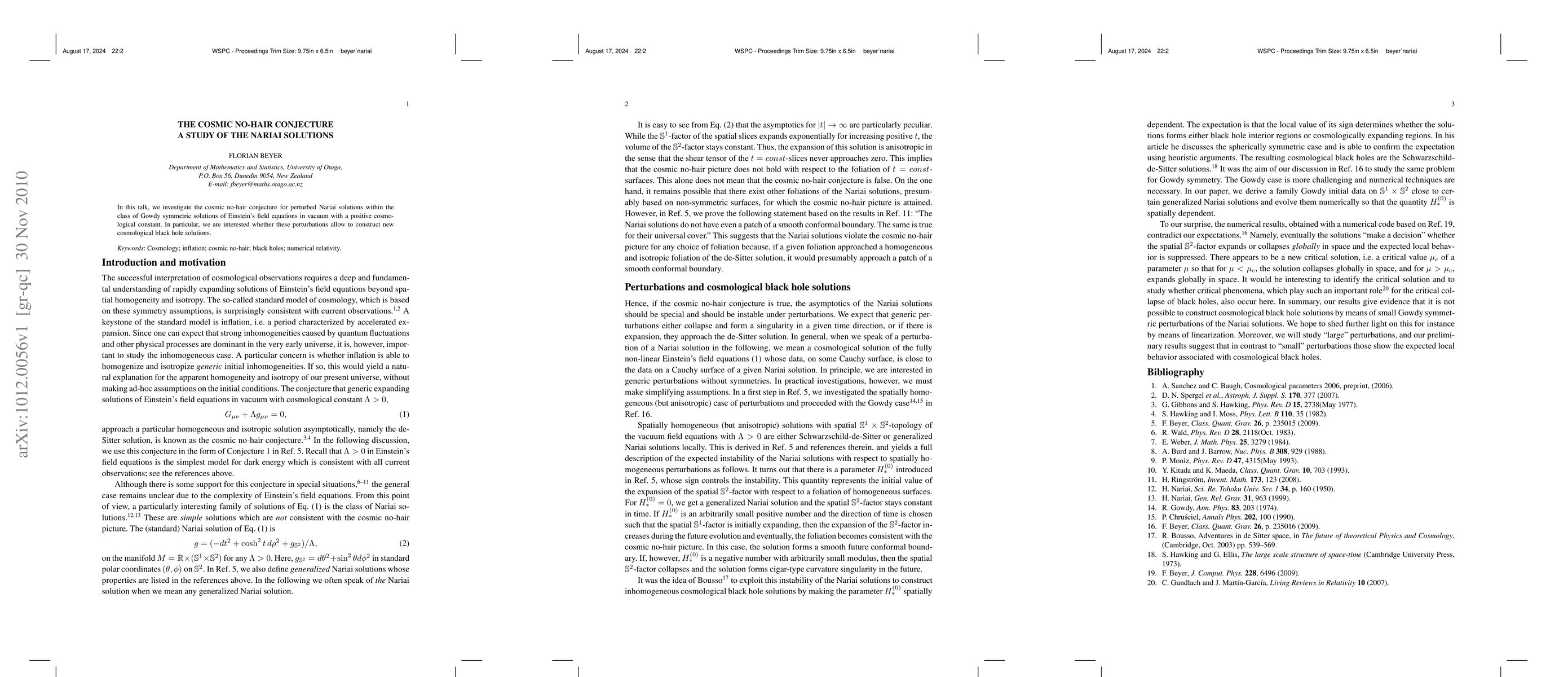 In this talk, we investigate the cosmic no-hair conjecture for perturbed Nariai solutions within the class of Gowdy symmetric solutions of Einstein's field equations in vacuum with a positive cosmological constant. In particular, we are interested whether these perturbations allow to construct new cosmological black hole solutions.
