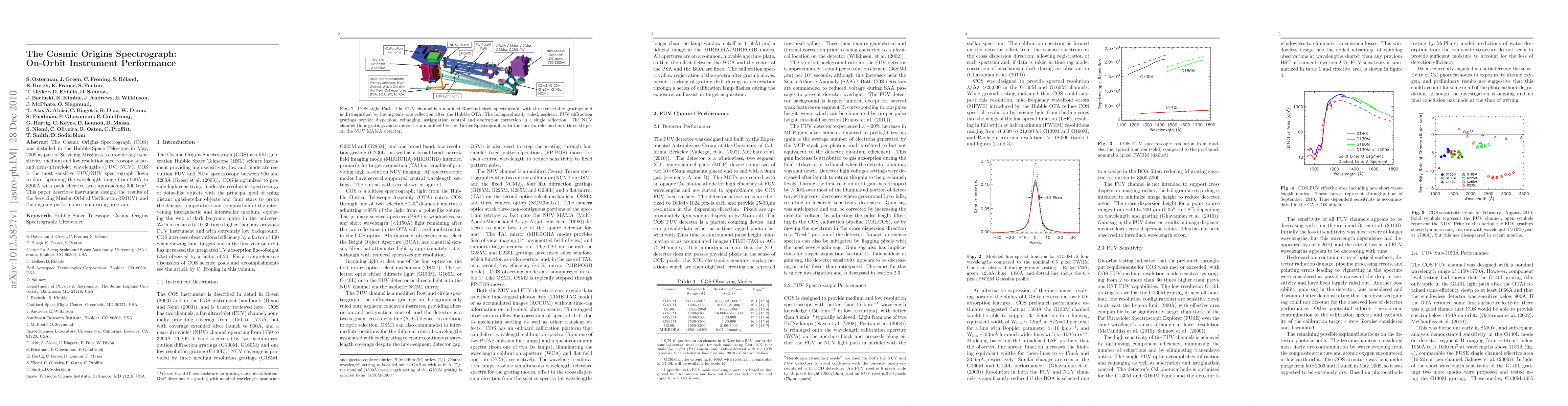 The Cosmic Origins Spectrograph (COS) installed in the Hubble Space Telescope in 2009 offers high sensitivity spectroscopy in far- and near-ultraviolet wavelengths. This paper details COS's design, successful orbital verification, and its ongoing performance monitoring.
