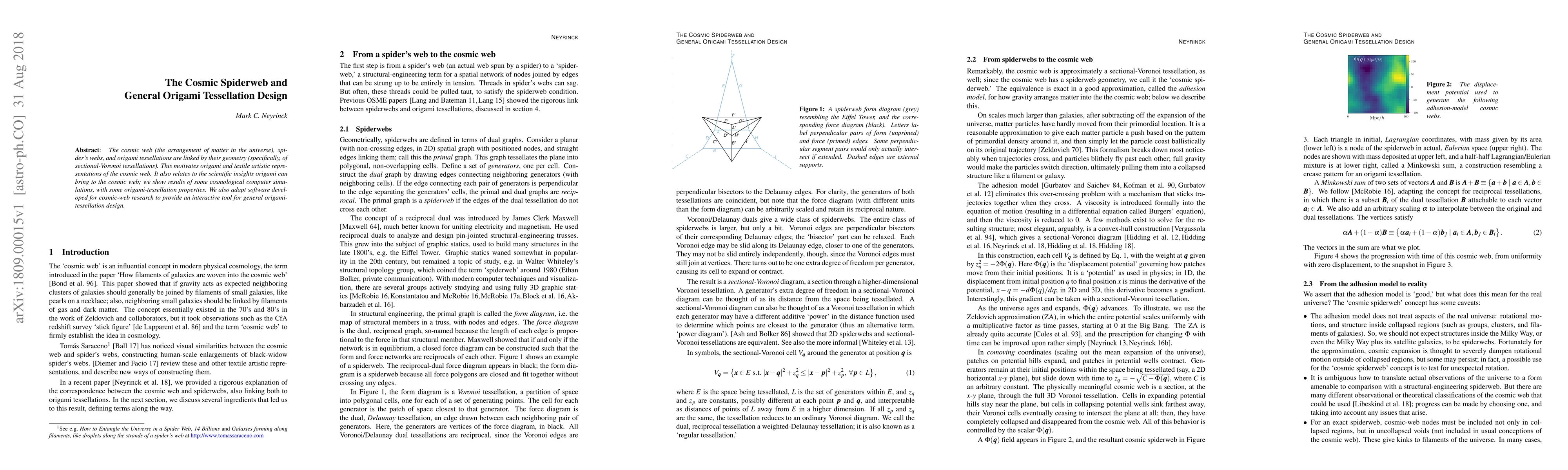 This paper explores the geometric similarities between the cosmic web, spider's webs, and origami tessellations, using sectional-Voronoi tessellations as a common framework. It demonstrates how origami can provide scientific insights into the cosmic web and introduces an interactive tool for general origami-tessellation design based on cosmic-web research software.