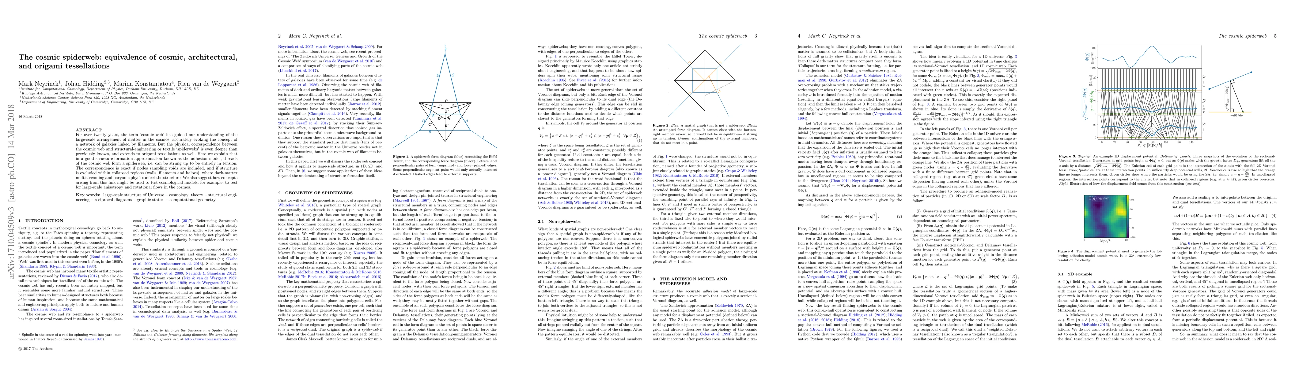 This paper explores the deep physical correspondence between the cosmic web and structural-engineering spiderwebs, extending to origami tessellations, revealing that the cosmic web forms a spiderweb in tension under the adhesion model. The study suggests using this analogy to test cosmological models for large-scale anisotropy and rotational flows.