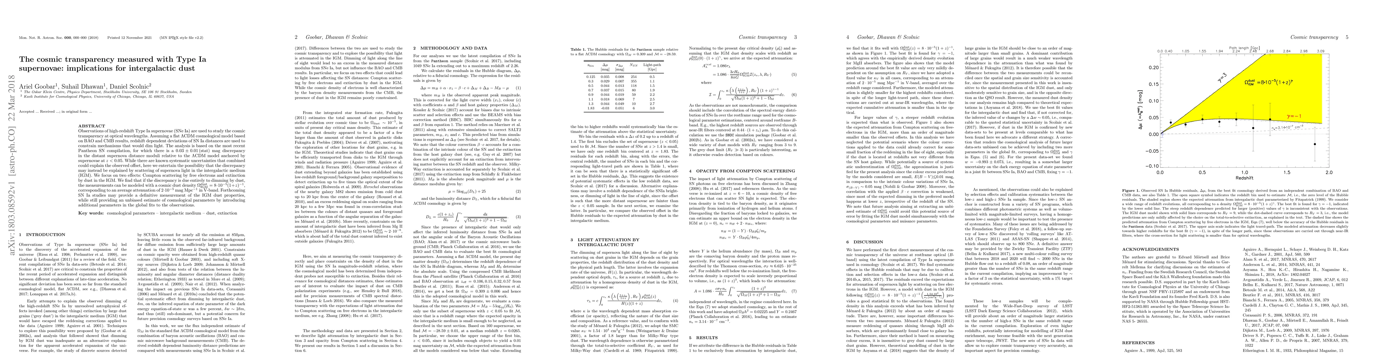 Observations of high-redshift Type Ia supernovae (SNe~Ia) are used to study the cosmic transparency at optical wavelengths. Assuming a flat $\Lambda$CDM cosmological model based on BAO and CMB results, redshift dependent deviations of SN~Ia distances are used to constrain mechanisms that would dim light. The analysis is based on the most recent Pantheon SN compilation, for which there is a $0.03\pm0.01 {\textrm \,(\rm stat)}$ mag discrepancy in the distant supernova distance moduli relative to the $\Lambda$CDM model anchored by supernovae at $z<0.05$. While there are known systematic uncertainties that combined could explain the observed offset, here we entertain the possibility that the discrepancy may instead be explained by scattering of supernova light in the intergalactic medium (IGM). We focus on two effects: Compton scattering by free electrons and extinction by dust in the IGM. We find that if the discrepancy is due entirely to dimming by dust, the measurements can be modeled with a cosmic dust density $\Omega_{\rm IGM}^{\rm dust} = 8 \cdot 10^{-5} (1+z)^{-1}$, corresponding to an average attenuation of $2\cdot 10^{-5}$ mag Mpc$^{-1}$ in V-band. Forthcoming SN~Ia studies may provide a definitive measurement of the IGM dust properties, while still providing an unbiased estimate of cosmological parameters by introducing additional parameters in the global fits to the observations.