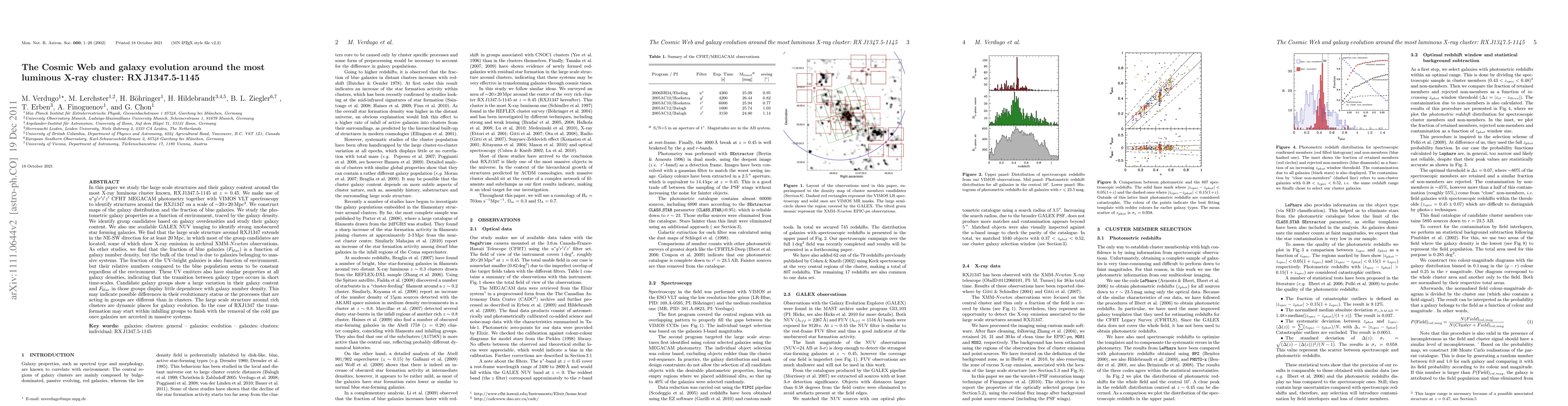 In this paper we study the large scale structures and their galaxy content around the most X-ray luminous cluster known, RX J1347.5-1145 at z=0.45. We make use of ugriz CFHT MEGACAM photometry and VIMOS VLT spectroscopy to identify structures around the RXJ1347 on a scale of 20x20 Mpc2. We construct maps of the galaxy distribution and the fraction of blue galaxies. We study the photometric galaxy properties as a function of environment, traced by the galaxy density. We identify group candidates based on galaxy overdensities and study their galaxy content. We also use available GALEX NUV imaging to identify strong unobscured star forming galaxies. We find that the large scale structure around RXJ1347 extends in the NE-SW direction for at least 20 Mpc, in which most of the group candidates are located. As other studies, we find that the fraction of blue galaxies (Fblue) is a function of galaxy number density, but the bulk of the trend is due to galaxies belonging to massive systems. The fraction of the UV-bright galaxies is also function of environment, but their relative numbers compared to the blue population seems to be constant regardless of the environment. These UV emitters also have similar properties at all galaxy densities, indicating that the transition between galaxy types occurs in short time-scales. Candidate galaxy groups show a large variation in their galaxy content and Fblue in those groups display little dependence with galaxy density. This may indicate possible differences in their evolutionary status or the processes that are acting in groups are different than in clusters. The large scale structure around rich clusters are dynamic places for galaxy evolution. In the case of RXJ1347 the transformation may start within infalling groups to finish with the removal of the cold gas once galaxies are accreted in massive systems. (ABRIDGED)