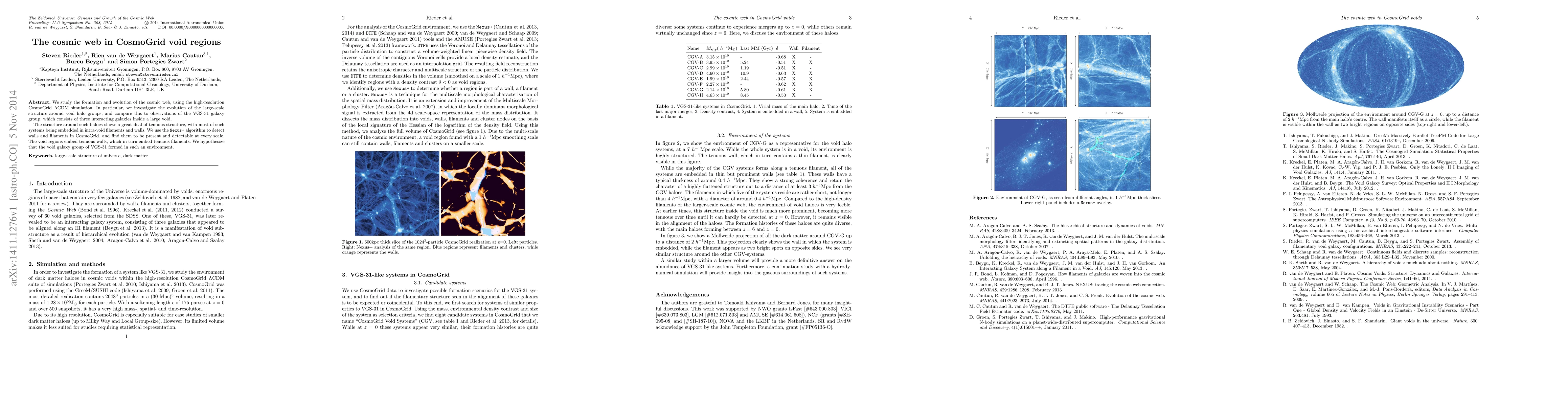 This paper investigates the cosmic web's formation and evolution using the high-resolution CosmoGrid simulation, focusing on the large-scale structure around void halo groups. It finds that void regions are embedded with tenuous walls and filaments, suggesting a similar environment for the formation of the VGS-31 galaxy group.