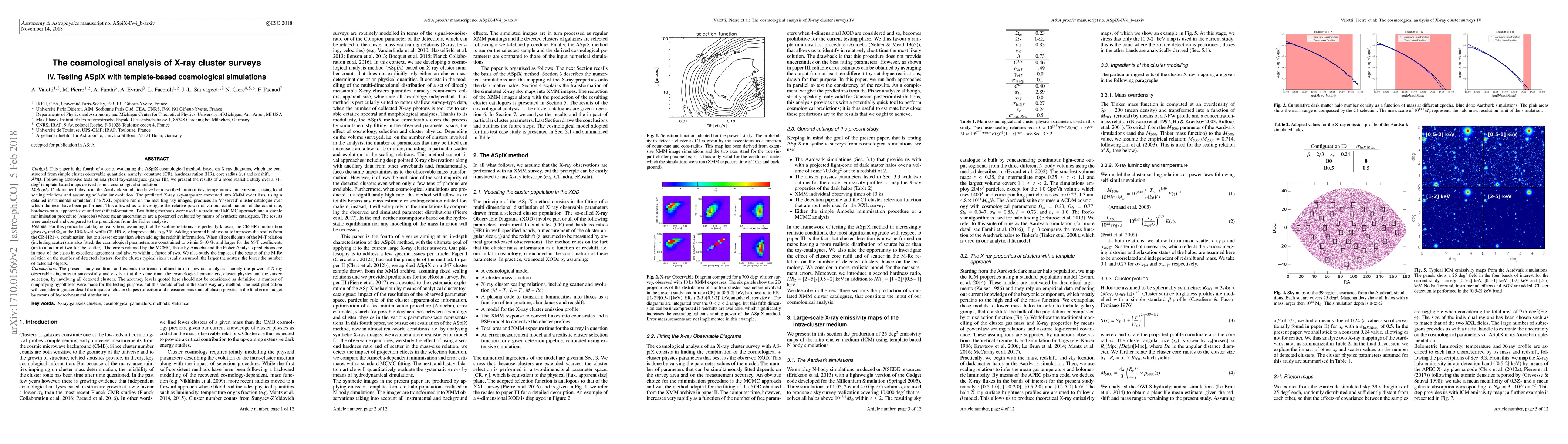 Following extensive tests on analytical toy-catalogues (paper III), we present the results of a more realistic study over a 711 deg2 template-based cosmological simulation. Dark matter halos from the Aardvark simulation have been ascribed luminosities, temperatures and core-radii, using local scaling relations and assuming self-similar evolution. Predicted X-ray sky-maps are converted into XMM event lists using an instrumental simulator. The XXL pipeline run on the resulting sky images, produces an 'observed' cluster catalogue over which the tests have been performed. This allowed us to investigate the relative power of various combinations of count-rate, hardness-ratio, apparent-size and redshift information. Two fitting methods were used : a traditional MCMC approach and a simple minimisation procedure (Amoeba) whose mean uncertainties are a posteriori evaluated by means of synthetic catalogues. Results were analysed and compared to the predictions from a Fisher analysis (FA). For this particular catalogue realisation, assuming perfectly known scaling relations, the CR-HR combination gives $\sigma_8$ and $\Omega_m$ at the 10% level, while CR-HR-r$_c$-z improves this to $\leq$ 3%. Adding a second hardness ratio improves results from the CR-HR1-r$_c$ combination, but to a lesser extent than adding redshift information. When all coefficients of the M-T relation (including scatter) are also fitted, cosmological parameters are constrained to within 5-10%, and larger for the M-T coefficients (up to a factor of two for the scatter). Errors returned by the MCMC, by Amoeba, and by FA predictions, are in most cases in excellent agreement and always within a factor of two. We also study the impact of the scatter of the M-Rc relation on the number of detected clusters: for the cluster typical sizes usually assumed, the larger the scatter, the lower the number of detected objects.