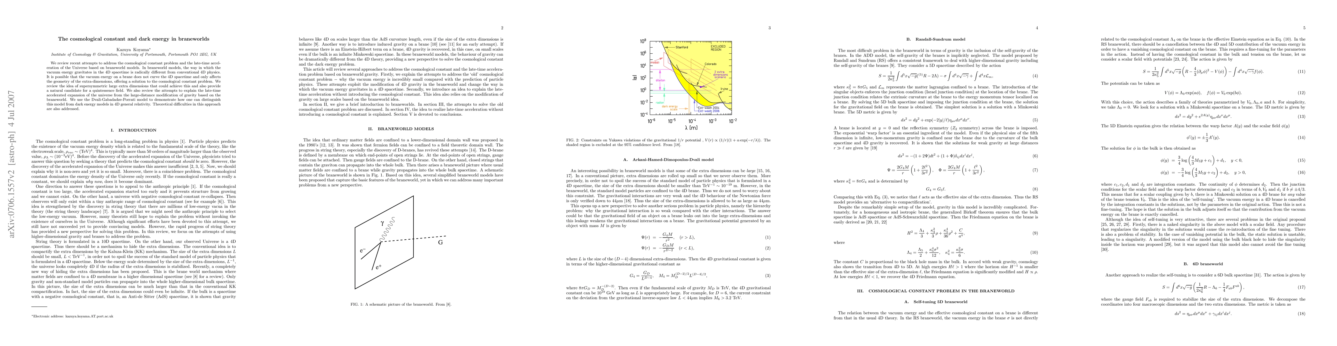 This paper reviews braneworld models addressing the cosmological constant problem and the universe's late-time acceleration, proposing that vacuum energy may not curve 4D spacetime but affect extra-dimensional geometry instead. It also explores supersymmetric large extra dimensions and the Dvali-Gabadadze-Porrati model to distinguish braneworld explanations from dark energy models.