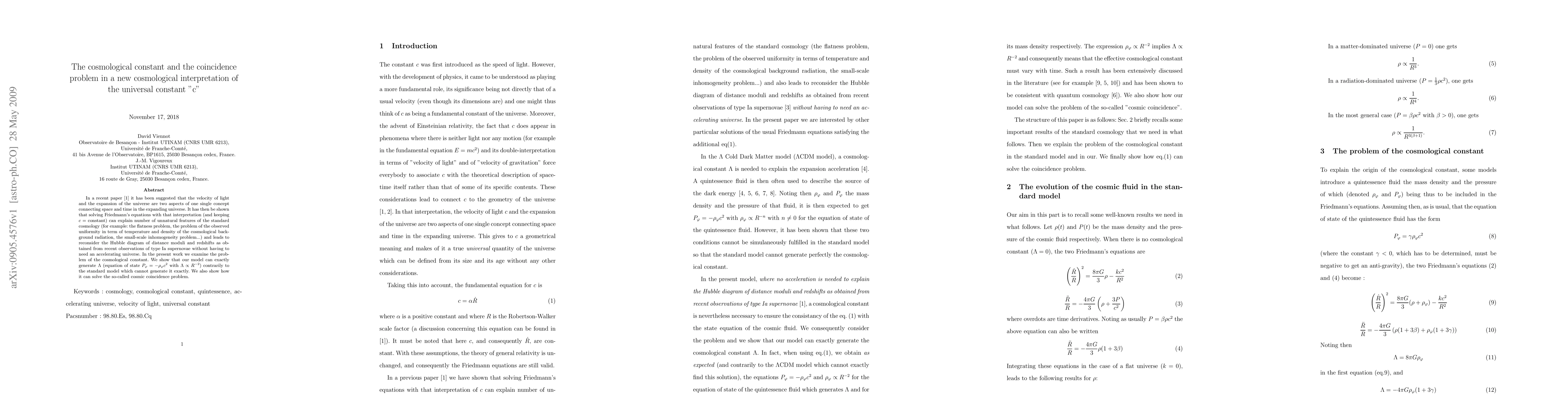 This paper proposes a new cosmological interpretation of the constant c, suggesting it connects light velocity and universe expansion, which resolves several cosmological issues without invoking dark energy. It demonstrates that the model can generate the cosmological constant and solve the cosmic coincidence problem.