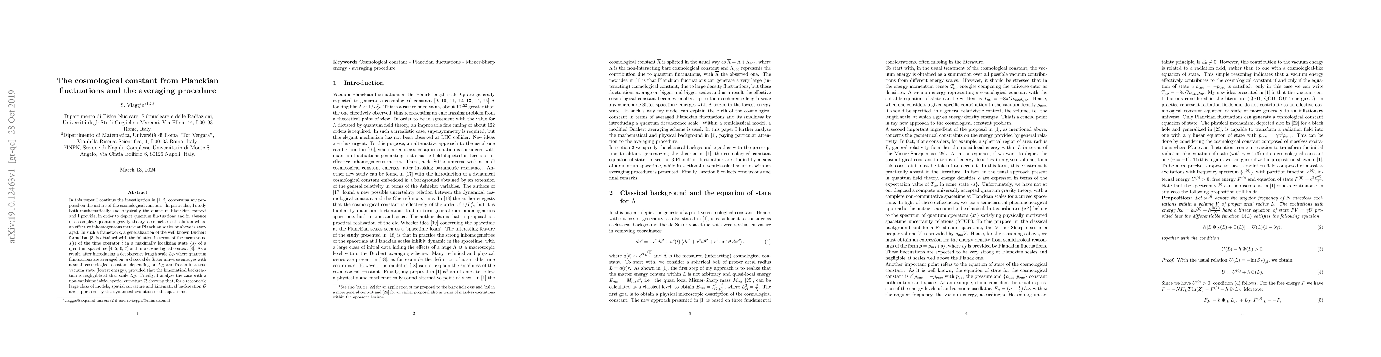 In this paper I continue the investigation in \cite{1,1b} concerning my proposal on the nature of the cosmological constant. In particular, I study both mathematically and physically the quantum Planckian context and I provide, in order to depict quantum fluctuations and in absence of a complete quantum gravity theory, a semiclassical solution where an effective inhomogeneous metric at Planckian scales or above is averaged. In such a framework, a generalization of the well known Buchert formalism \cite{2} is obtained with the foliation in terms of the mean value $s(\hat{t})$ of the time operator $\hat{t}$ in a maximally localizing state $\{s\}$ of a quantum spacetime \cite{3,4,5,6} and in a cosmological context \cite{7}. As a result, after introducing a decoherence length scale $L_D$ where quantum fluctuations are averaged on, a classical de Sitter universe emerges with a small cosmological constant depending on $L_D$ and frozen in a true vacuum state (lowest energy), provided that the kinematical backreaction is negligible at that scale $L_D$. Finally, I analyse the case with a non-vanishing initial spatial curvature $\mathcal{R}$ showing that, for a reasonable large class of models, spatial curvature and kinematical backreation $\mathcal{Q}$ are suppressed by the dynamical evolution of the spacetime.
