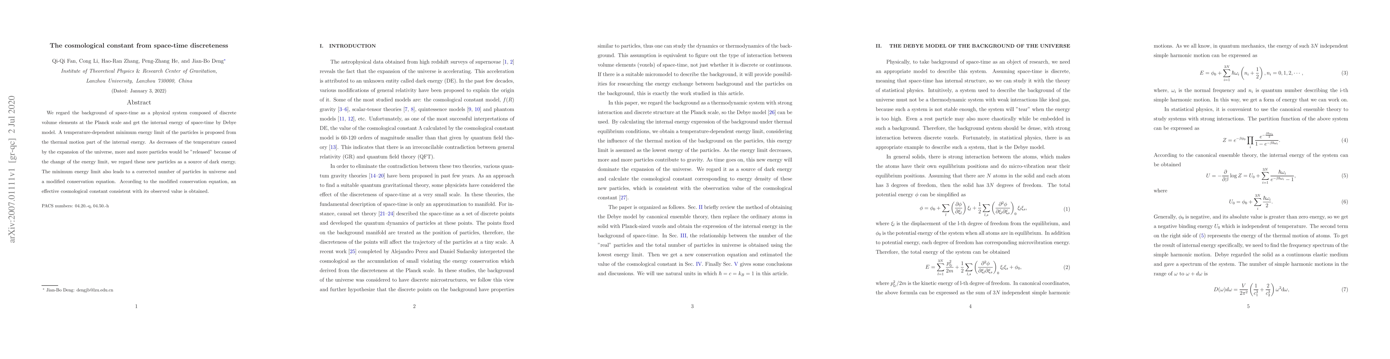We regard the background of space-time as a physical system composed of discrete volume elements at the Planck scale and get the internal energy of space-time by Debye model. A temperature-dependent minimum energy limit of the particles is proposed from the thermal motion part of the internal energy. As decreases of the temperature caused by the expansion of the universe, more and more particles would be"released" because of the change of the energy limit, we regard these new particles as a source of dark energy. The minimum energy limit also leads to a corrected number of particles in universe and a modified conservation equation. According to the modified conservation equation, an effective cosmological constant consistent with its observed value is obtained.