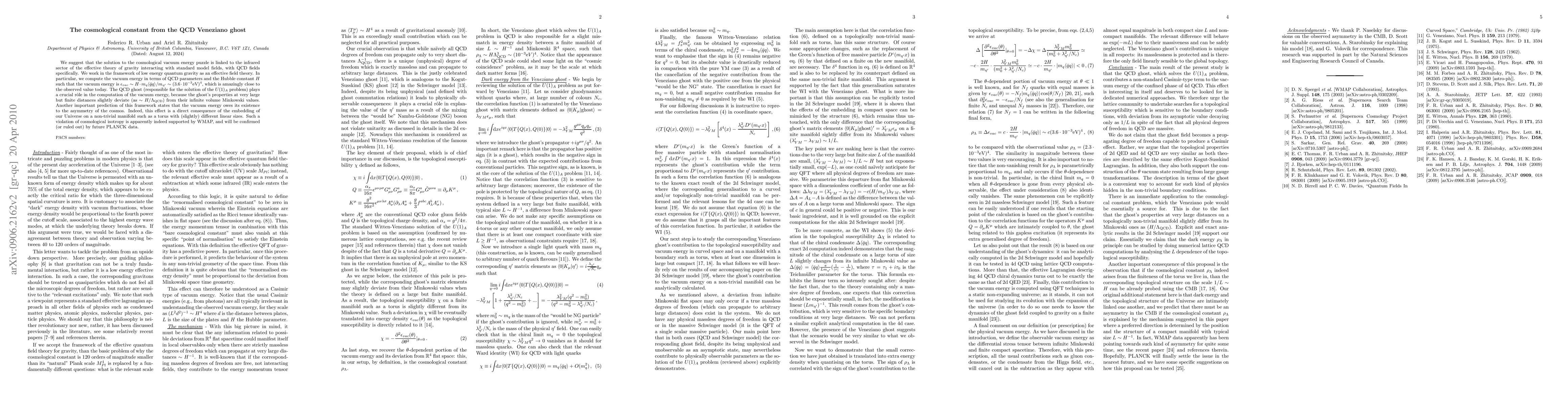 We suggest that the solution to the cosmological vacuum energy puzzle is linked to the infrared sector of the effective theory of gravity interacting with standard model fields, with QCD fields specifically. We work in the framework of low energy quantum gravity as an effective field theory. In particular, we compute the vacuum energy in terms of QCD parameters and the Hubble constant $H$ such that the vacuum energy is $\epsilon_{vac} \sim H \cdot m_q\la\bar{q}q\ra /m_{\eta'} \sim (3.6\cdot 10^{-3} \text{eV})^4$, which is amazingly close to the observed value today. The QCD ghost (responsible for the solution of the $U(1)_A$ problem) plays a crucial r\^ole in the computation of the vacuum energy, because the ghost's properties at very large but finite distances slightly deviate (as $\sim H / \Lqcd $) from their infinite volume Minkowski values. Another important prediction of this framework states that the vacuum energy owes its existence to the asymmetry of the cosmos. Indeed, this effect is a direct consequence of the embedding of our Universe on a non-trivial manifold such as a torus with (slightly) different linear sizes. Such a violation of cosmological isotropy is apparently indeed supported by WMAP, and will be confirmed (or ruled out) by future PLANCK data.
