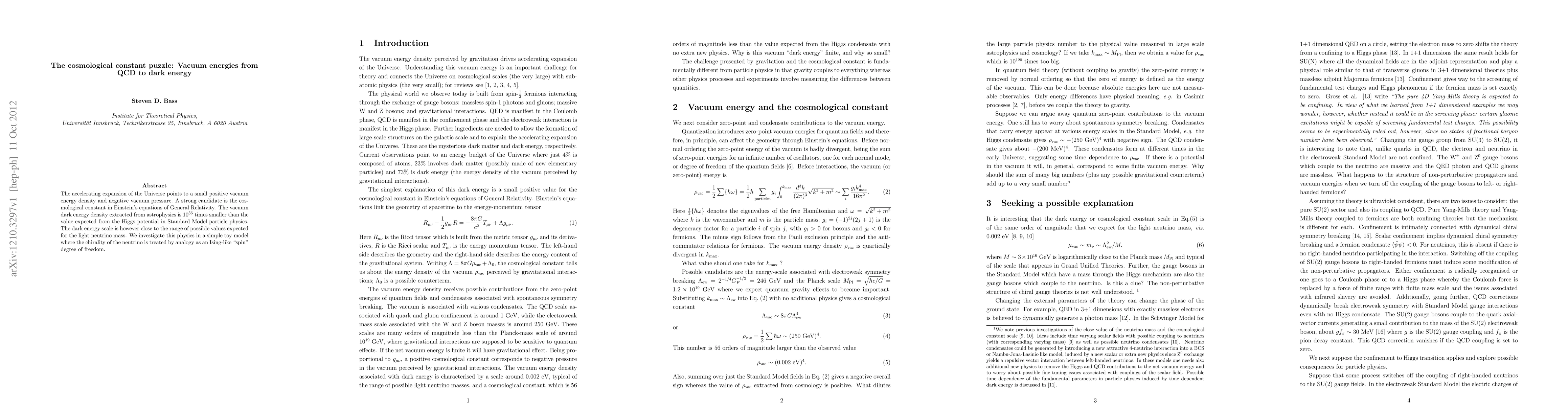 The paper explores the discrepancy between the observed vacuum energy density driving the Universe's expansion and the much larger value predicted by particle physics, proposing a simple model to relate neutrino chirality to dark energy. The model suggests a possible connection between the cosmological constant and the mass of light neutrinos.